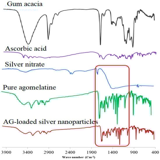 FTIR spectra of pure agomelatine, unprocessed silver nitrate, gum acacia, ascorbic acid, and the prepared silver nanoparticles.