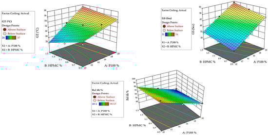 The GS is a measure of the mechanical properties of the in situ gel, which are crucial for ensuring that the gel remains intact during administration [39]. The data shows a clear increase in GS as the percentage of both P188 and HPMC K15M is increased. For example, GS rises from 31 s in F1 (10%, w/v P188 and 0.5%, w/v HPMC K15M) to 54 s in F9 (20%, w/v P188 and 1.5%, w/v HPMC K15M). This suggests a synergistic effect where both P188 and HPMC contribute to a more robust in situ gel matrix. The impact of P188 is more pronounced at a higher percentage of HPMC K15M. The increase in GS is more significant when both P188 and HPMC K15M are at their highest percent (F9). This indicates that the interaction between P188 and HPMC K15M is critical in enhancing the mechanical properties of the prepared in situ gel [15]. The interaction term (AB) in the ANOVA table shows significance, supporting the observation that the combined effect of P188 and HPMC on GS is non-additive and noteworthy (Figure 6 and Figure 7 and Table 1). The following equation can be applied to explain the effect of P188 and HPMC K15M percent on the GS.