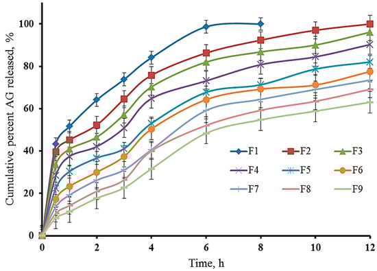 In vitro release profile of AG from various rectal in situ gel formulations (data expressed as the mean ± SD, n = 3). The various formulations are coded with F1, F2, F3, … and F9.