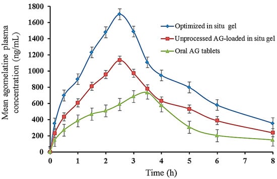 Nine male albino rabbits weighing 1.8–2.25 kg were randomly divided into three groups (I, II, and III) and housed individually in plastic cages at room temperature with free access to food and water. The rabbits were fasted for 24 h before and during the in vivo study. Group I (n = 3) received the optimized in situ gel formulation (5 mg/kg body weight) into the animal rectum 5 cm above the anus using a plastic syringe. Group II (n=3) received the unprocessed AG-loaded in situ gel formula with the same composition as the optimized formula (5 mg/kg body weight) into the animal rectum 5 cm above the anus using a plastic syringe. Group III (n = 3) received oral tablets of AG (5 mg/kg) by an intragastric tube (Agovald® tablet). After administration of the different AG formulations, 1 mL blood samples were collected in a capped tube infiltrated with a heparin sodium solution at time intervals of 0.166, 0.5, 1, 1.5, 2, 3, 4, 6, and 8 h post-dosing from the marginal ear vein of each rabbit. Blood samples were centrifuged at 3000 rpm for 20 min. The obtained plasma samples were stored at −20 °C until analysis. For AG extraction, 500 μL of plasma samples were transferred to a labeled tube, then 2 mL ethyl acetate (extraction solvent) was added, and the mixture was vigorously shaken for 15 min and then centrifuged at 4000 rpm for 5 min. The separated supernatant was evaporated under nitrogen gas, and the residue was reconstituted with the mobile phase (100 µL) and filtered [73]. An Aliquot of 20 μL was injected into auto-sampler vials and assessed for the AG concentration by the HPLC method.