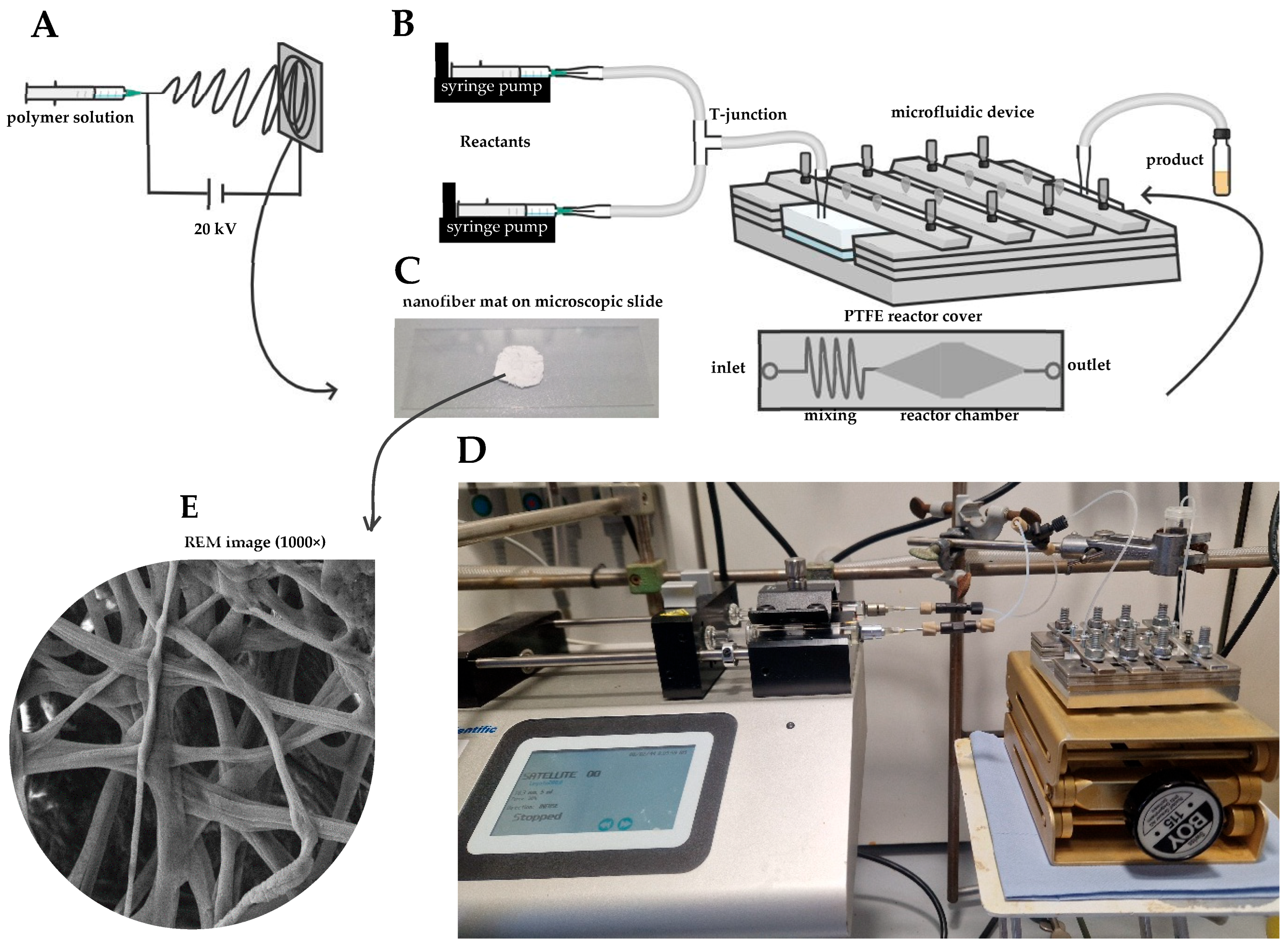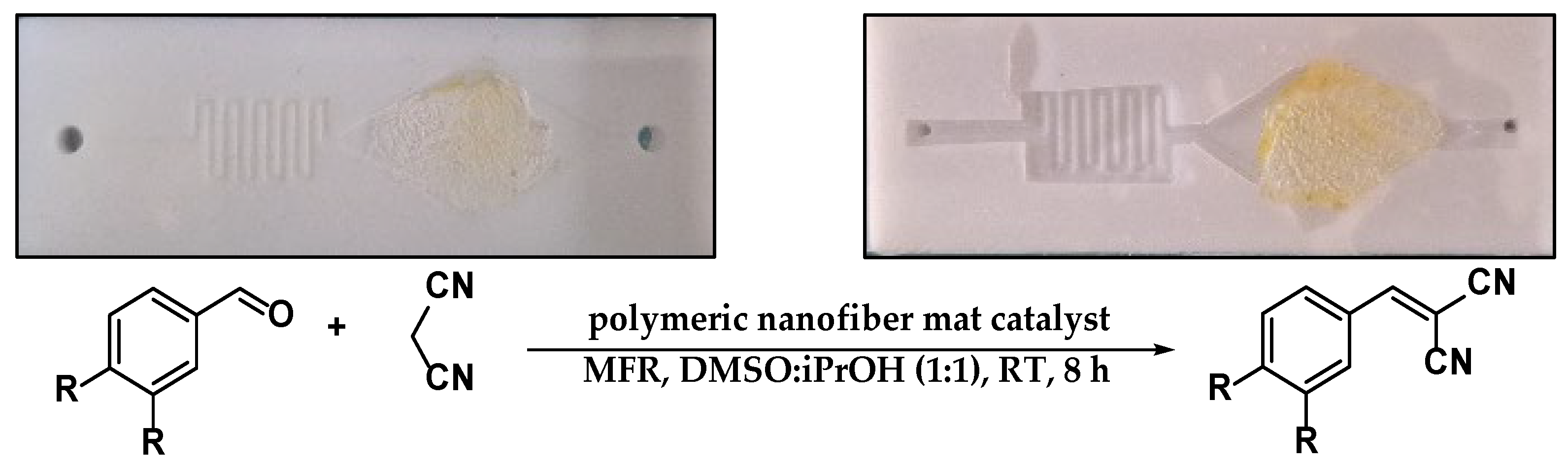 For these reasons, the present work aims to synthesize aromatic and aliphatic malononitrile derivatives using a microfluidic reactor setup (MFR) and heterogeneous catalysis. In accordance with this objective, the initial step is the development and synthesis of polymer structures that are suitable for the immobilization of tertiary amines. Subsequently, these structures must undergo processing into nanofibers through electrospinning technique (