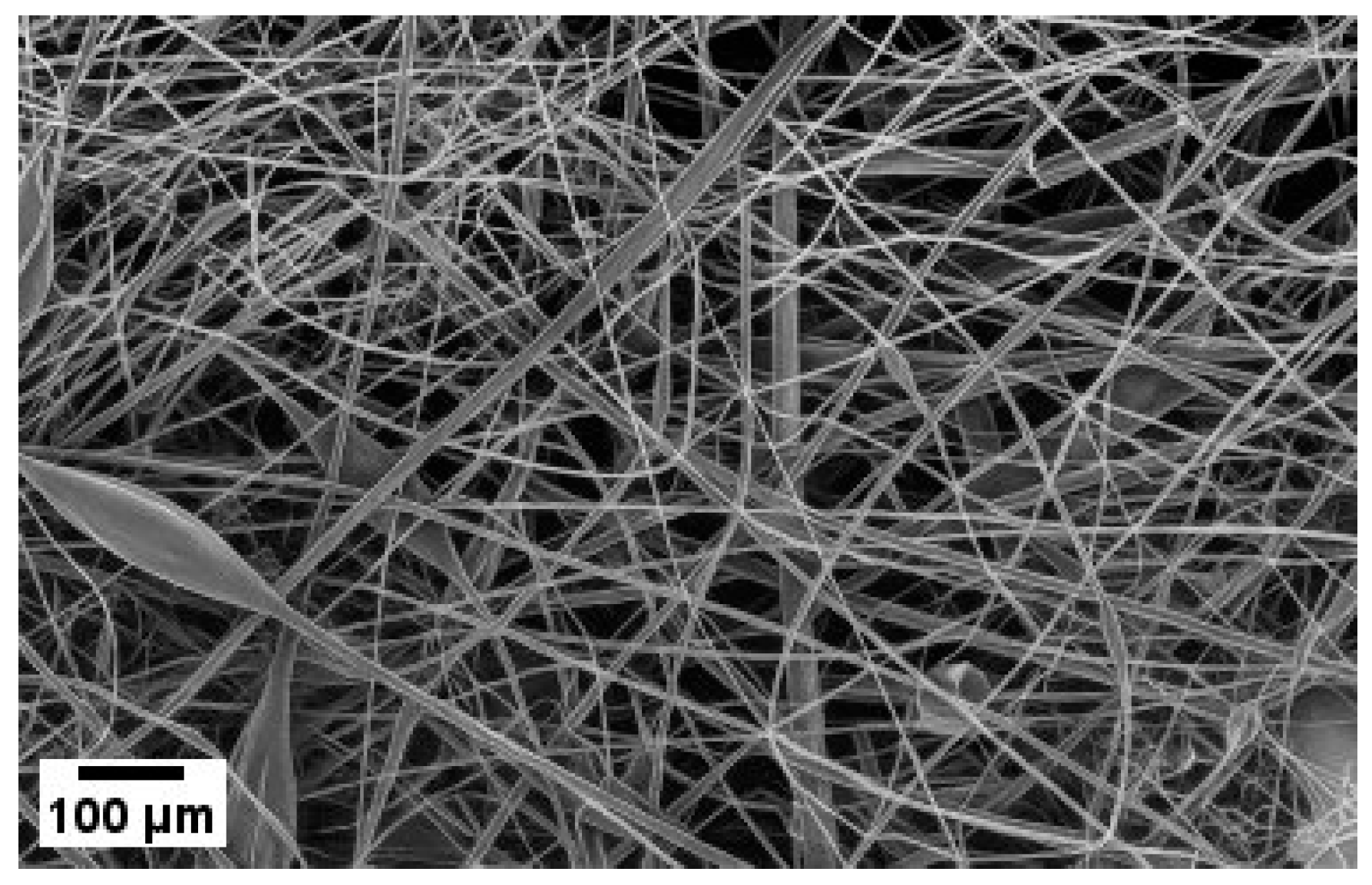 Figure 2 shows a SEM image of the manufactured structures at a magnification of 1000× immediately after the electrospinning process. The investigation revealed the presence of isolated nanofibers in the sample.