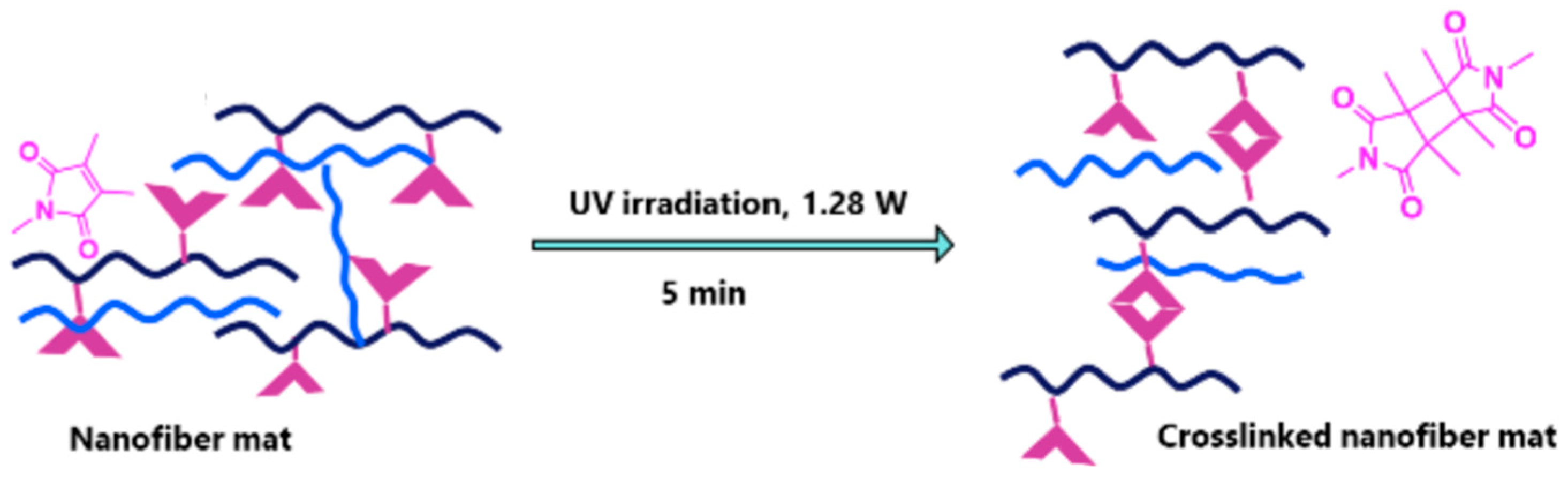 Subsequent to the manufacturing process, the nanofiber mats were stored in conditions that prevented exposure to light. Immediately before utilization in catalysis within the microfluidic device, the mats were subjected to cross-linking through UV irradiation at a power of 1.28 W for a duration of 5 min. The photo-crosslinker, which contains 3,4-dimethylmaleimide functionalities, facilitates the formation of a cyclobutene rings between the polymeric side chains via a [2 + 2] cycloaddition, thereby creating a polymer network (