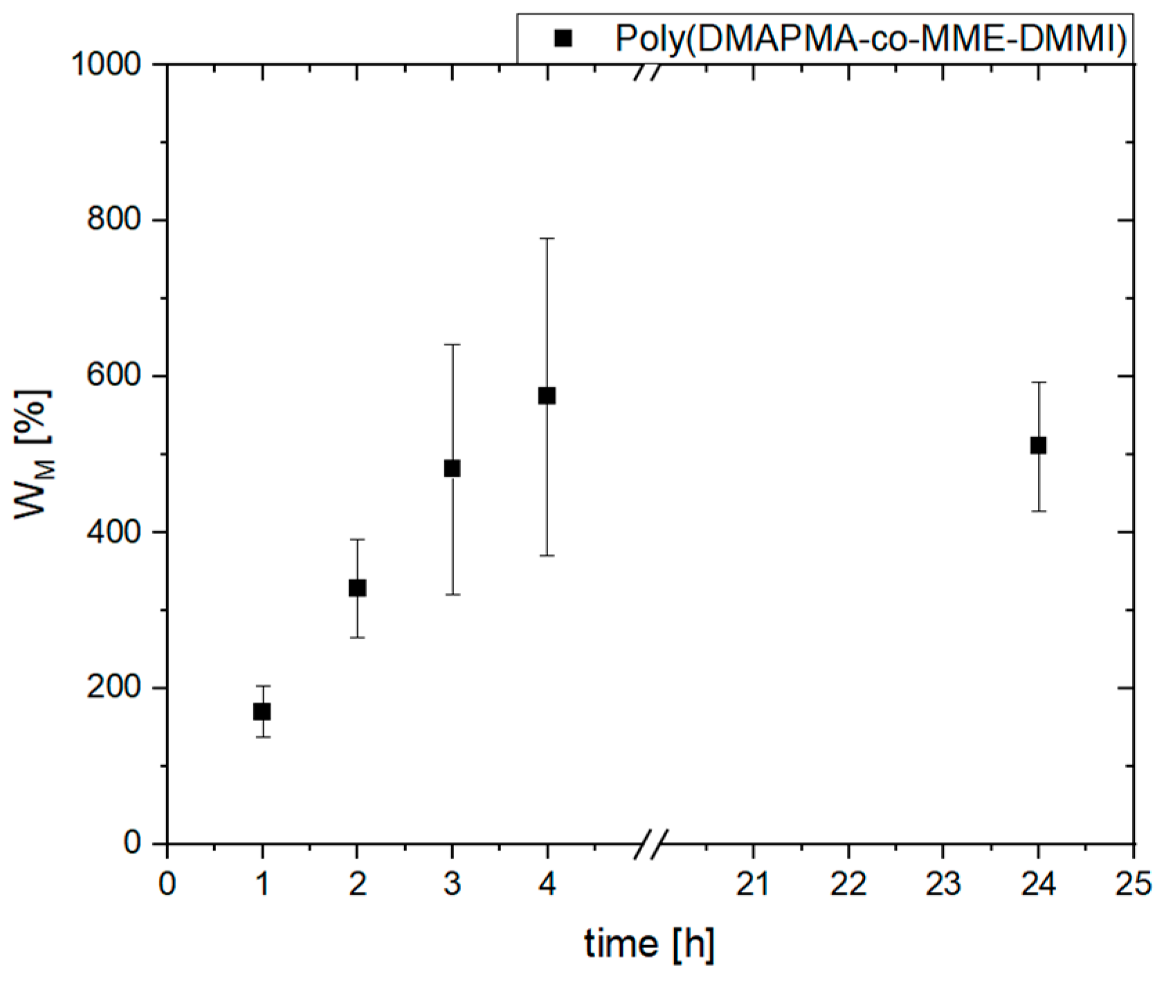 39]. In order to investigate these swelling properties of the polymers in detail, swelling studies were carried out in the reaction solvent mixture DMSO:iPrOH (1:1) at room temperature. At designated time intervals of 1 h, 2 h, 3 h, 4 h and 24 h, the gels were weighted, and light microscopic images were recorded. Examining the results, after 24 h, gels of Poly(DMAPMA-co-MME-DMMI) (