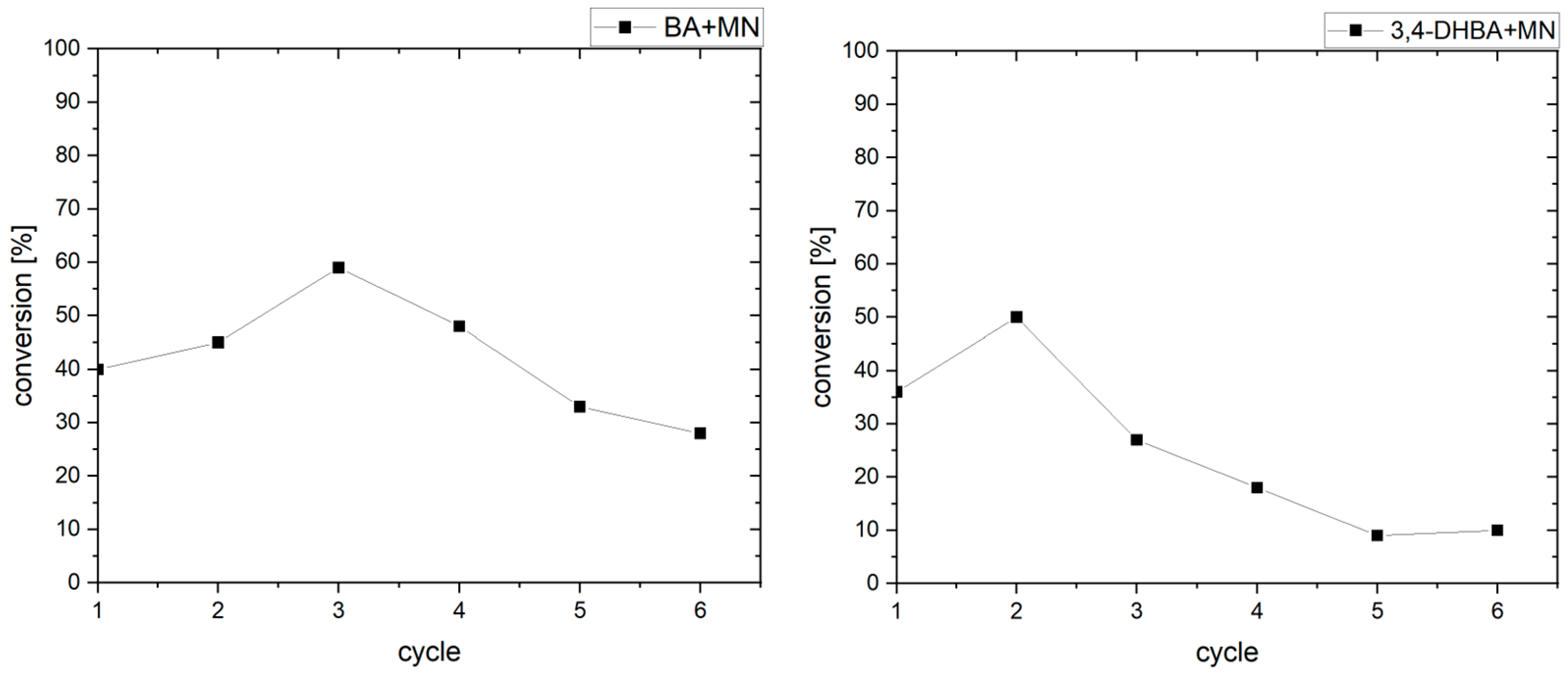 4 showed reusability but also a decrease in NMR yields after two or three cycles, respectively, yielding a NMR yield of 30% in the reaction of benzaldehyde in the sixth cycle, and a yield of 10% in the reaction of 3,4-dihydroxybenzaldehyde (