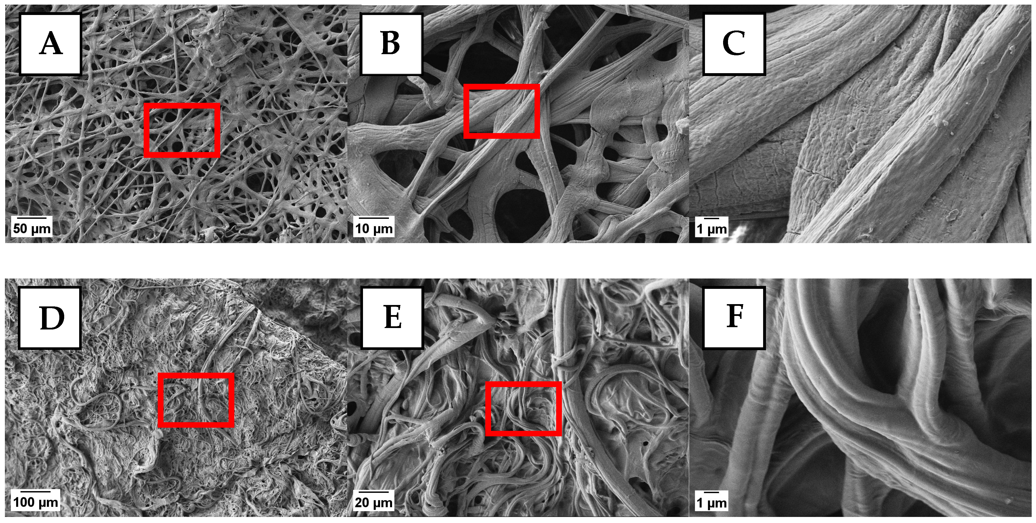 Figure 7A–C demonstrates a connection of overlapping fibers after the crosslinking process. Furthermore, there are minor regions that exhibit slight film formation.