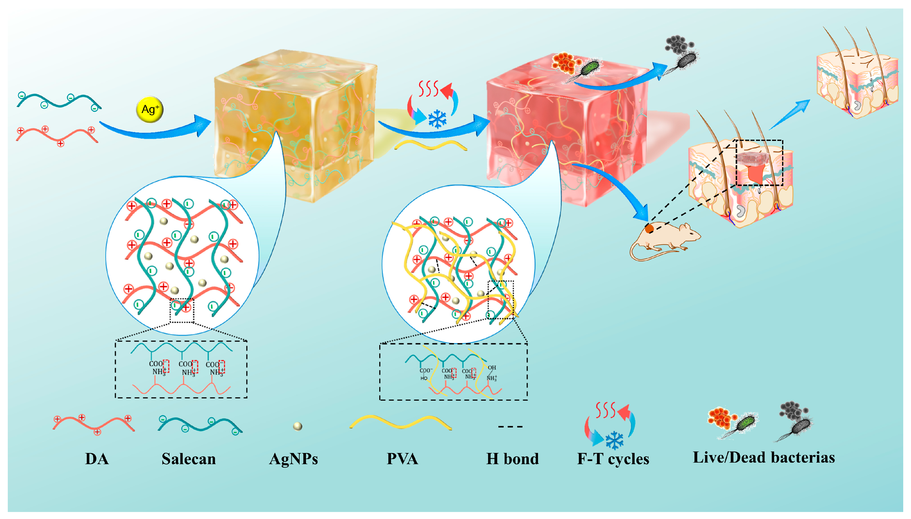 - Deng, K.; Huang, Q.; Yan, X.; Dai, Y.; Zhao, J.; Xiong, X.; Wang, H.; Chen, X.; Chen, P.; Liu, L. Facile fabrication of a novel, photodetachable salecan-based hydrogel dressing with self-healing, injectable, and antibacterial properties based on metal coordination. Int. J. Biol. Macromol. 2024, 264, 130551. [Google Scholar] [CrossRef]