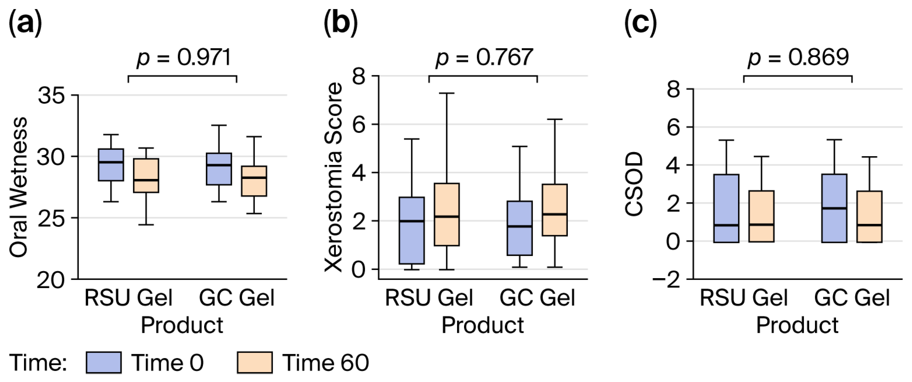 | Did the product make swallowing easier? | 29 (78) | 31 (84) | 0.687 |