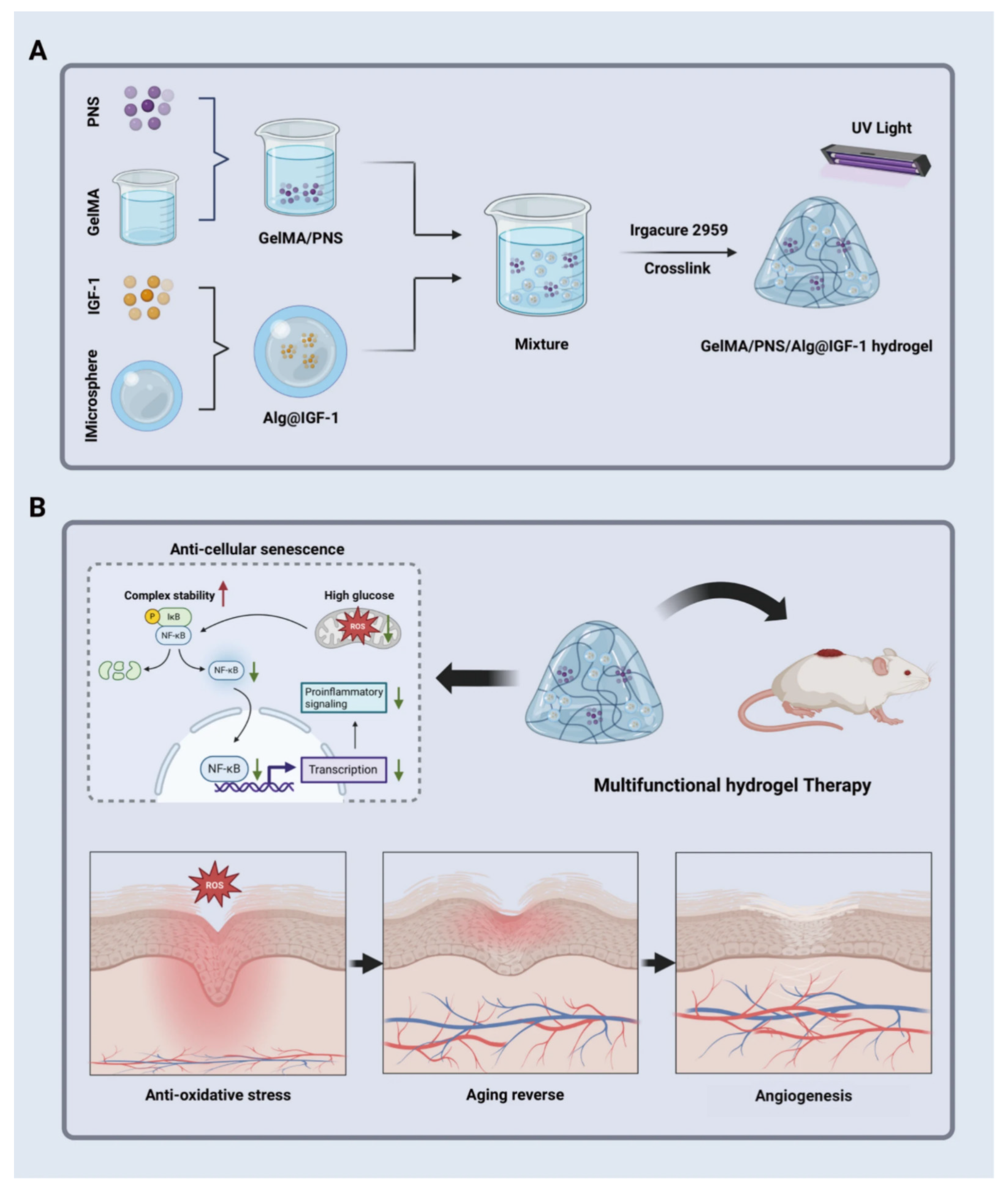- Yang, H.; Chen, Y.; Rong, Y.; Zhou, Y.; Li, S.; Li, X.; Wu, H.; Lv, D.; Cao, X.; Wang, P.; et al. Multifunctional hydrogel targeting senescence to accelerate diabetic wound healing through promoting angiogenesis. J. Nanobiotechnol. 2025, 23, 177. [Google Scholar] [CrossRef] [PubMed]