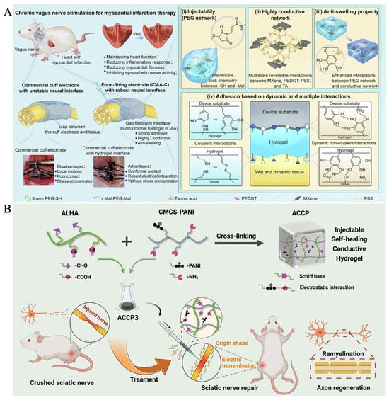 (A) Schematic illustration of the form-fitting cuff electrode (ICAA-C) enabled by the ICAA hydrogel for chronic vagus nerve stimulation [50] (Copyright © 2024, Yang et al. under the terms of the Creative Commons CC BY 4.0). (B) Design and application of conductive ACCP3 hydrogels for nerve repair [51] (Adapted with permission from Yi et al. Copyright 2023 Elsevier).