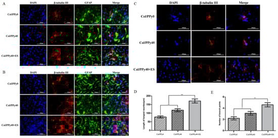 (A) Confocal microscopy images of NSCs differentiation on day 3 with the prepared hydrogels [53] (Copyright © 2022, Xu et al. under the terms of the Creative Commons CC BY 4.0). (B) Confocal microscopy images of NSCs differentiation on day 7 with the prepared hydrogels [53] (Copyright © 2022, Xu et al. under the terms of the Creative Commons CC BY 4.0). (C) Representative fluorescent images of NSC-derived neurons cultured in Col/PPy0, Col/PPy40, and Col/PPy40 + ES (200 mV) groups [53] (Copyright © 2022, Xu et al. under the terms of the Creative Commons CC BY 4.0). (D) Neurite length of NSC-derived neurons in different groups. Data are presented as mean ± SD. * p < 0.05, ** p < 0.01 [53] (Copyright © 2022, Xu et al. under the terms of the Creative Commons CC BY 4.0). (E) Number of branch points of NSC-derived neurons in different groups [53] (Copyright © 2022, Xu et al. under the terms of the Creative Commons CC BY 4.0). All scar bars have a length of 100 μm.