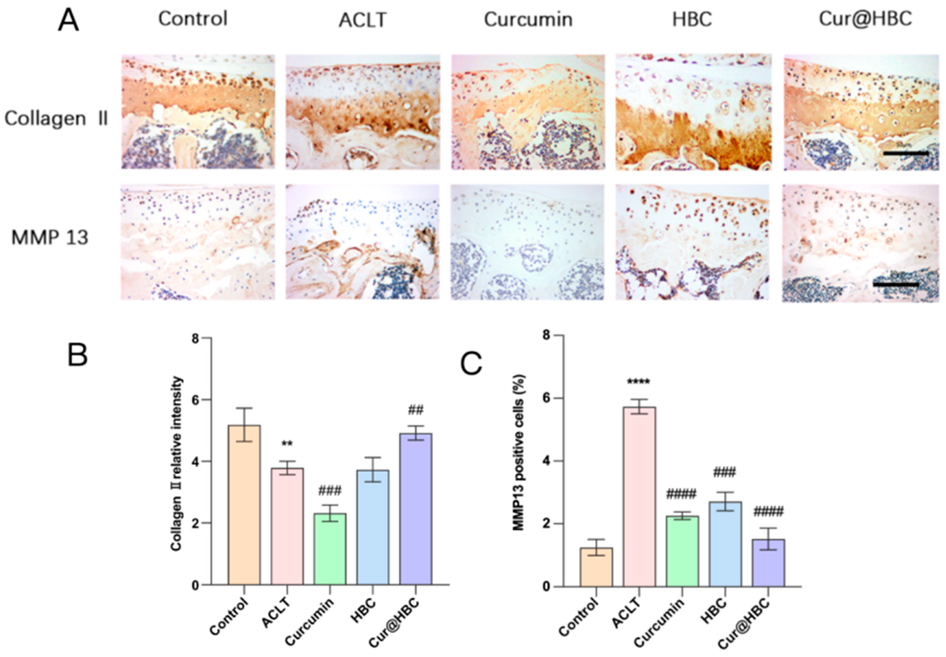 2.1.3. Cur@HBC Treatment Preserves Joint Structure and Improves Motor Function in ACLT-Induced Osteoarthritis