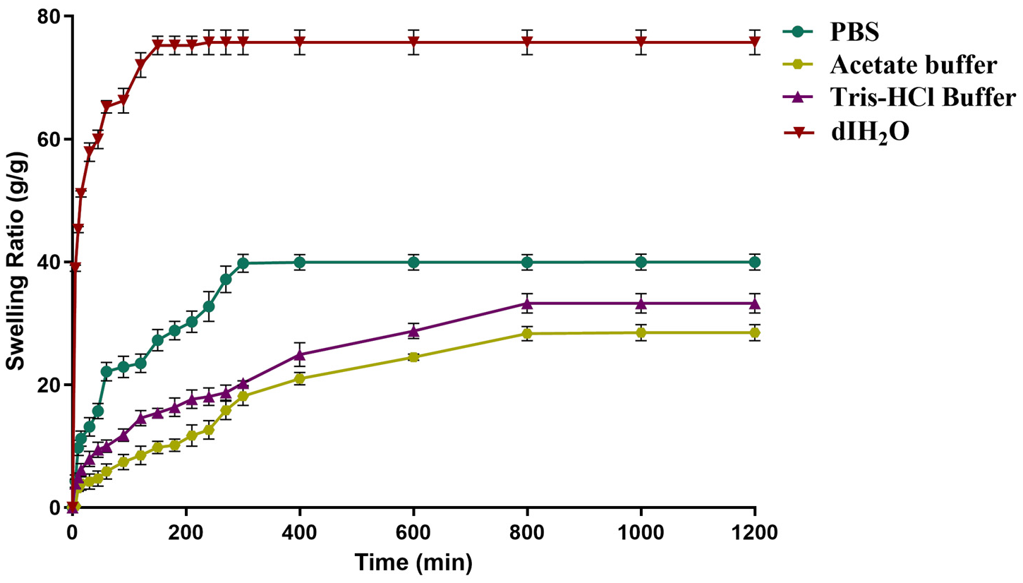2.3. Water Absorbency and Swelling Behavior of Dextran Hydrogel