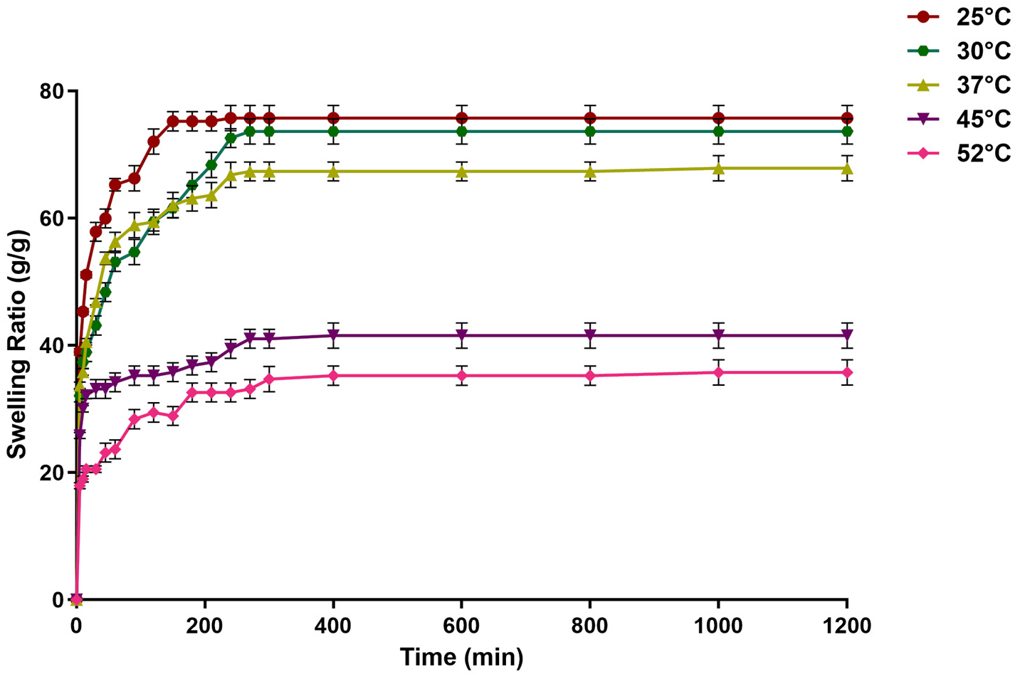 2.5. Effect of Temperature on the Swelling of the Dextran Hydrogel