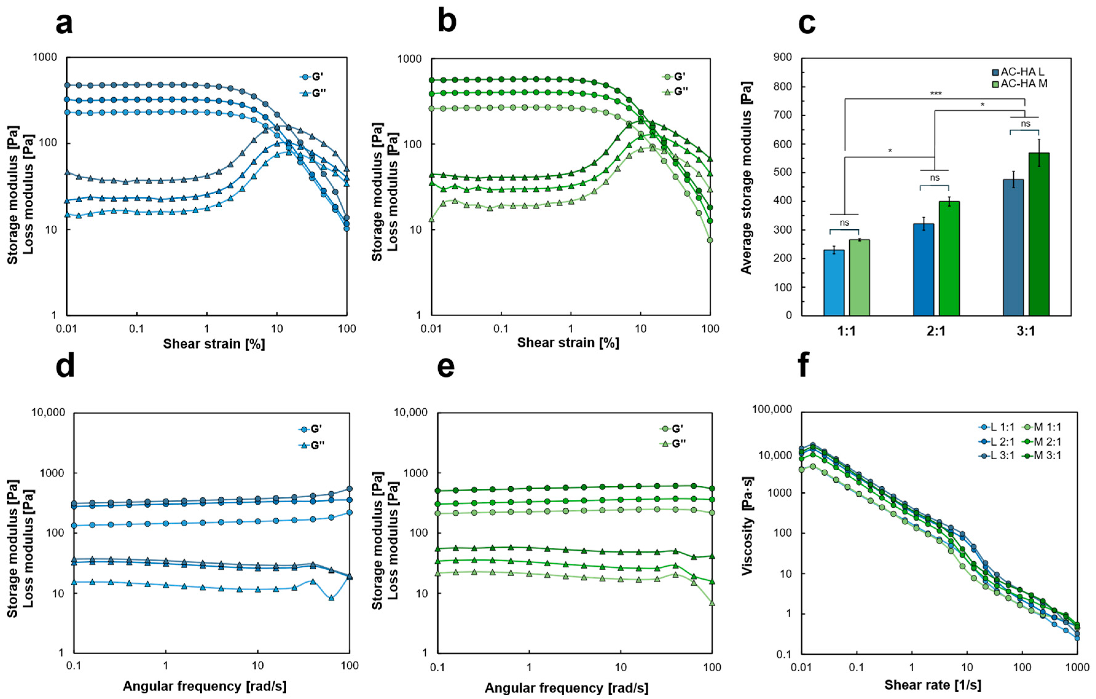 - La Gatta, A.; Bedini, E.; Aschettino, M.; Finamore, R.; Schiraldi, C. Hyaluronan Hydrogels: Rheology and Stability in Relation to the Type/Level of Biopolymer Chemical Modification. Polymers 2022, 14, 2402. [Google Scholar] [CrossRef]