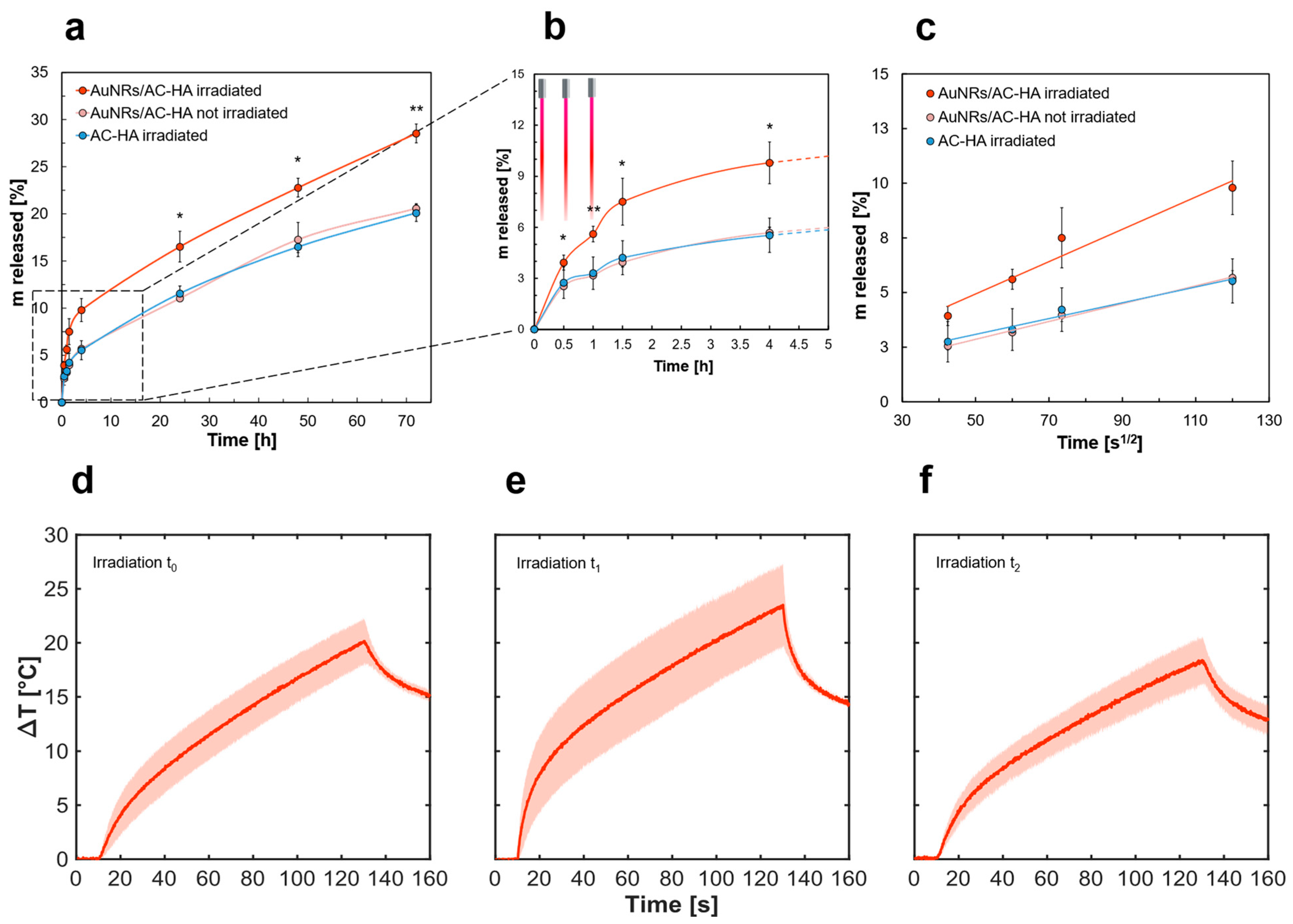 2.5. AuNR/AC-HA Hydrogel Nanocomposites’ Light-Induced Drug Delivery