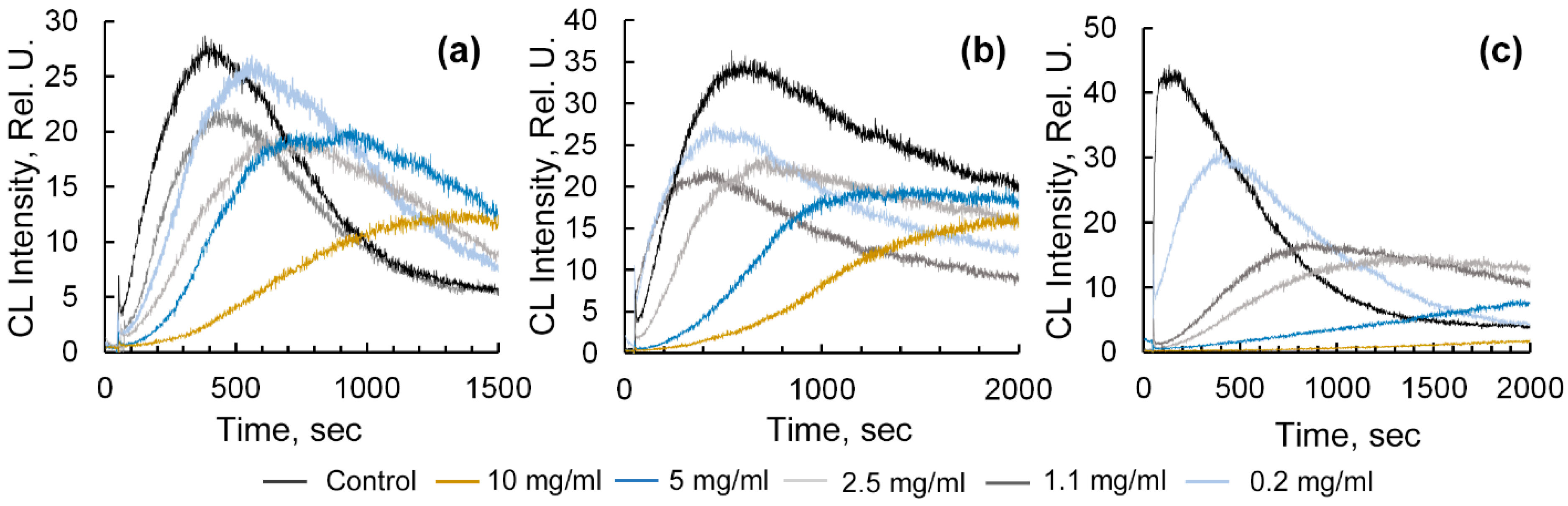 4.4.1. Evaluation of Antiradical Activity Using the Radical-Generating System «Horseradish Peroxidase-Hydrogen Peroxide-Luminol»