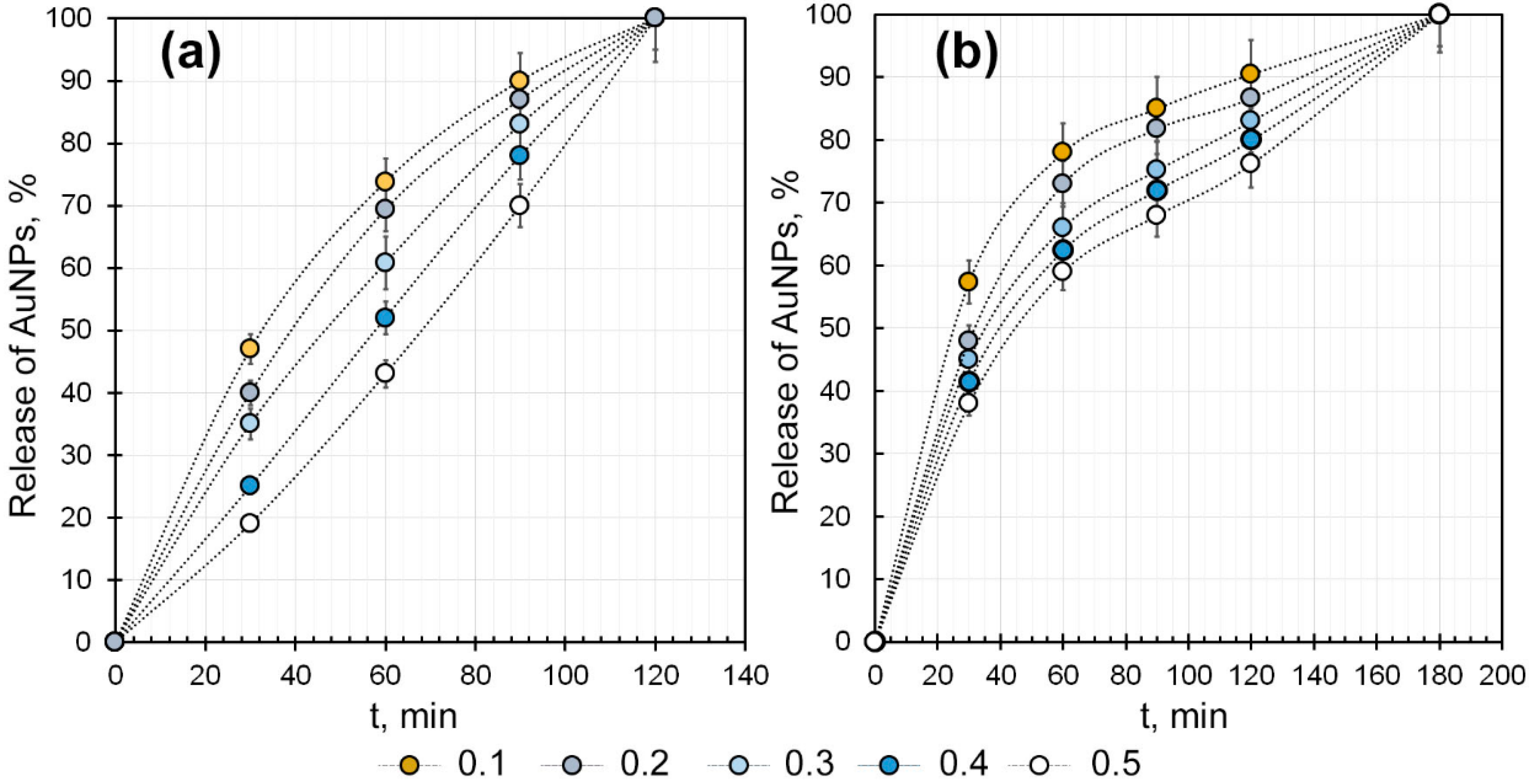 4.7. Study of AuNPs Release Dynamics from Hydrogels in Aqueous Medium