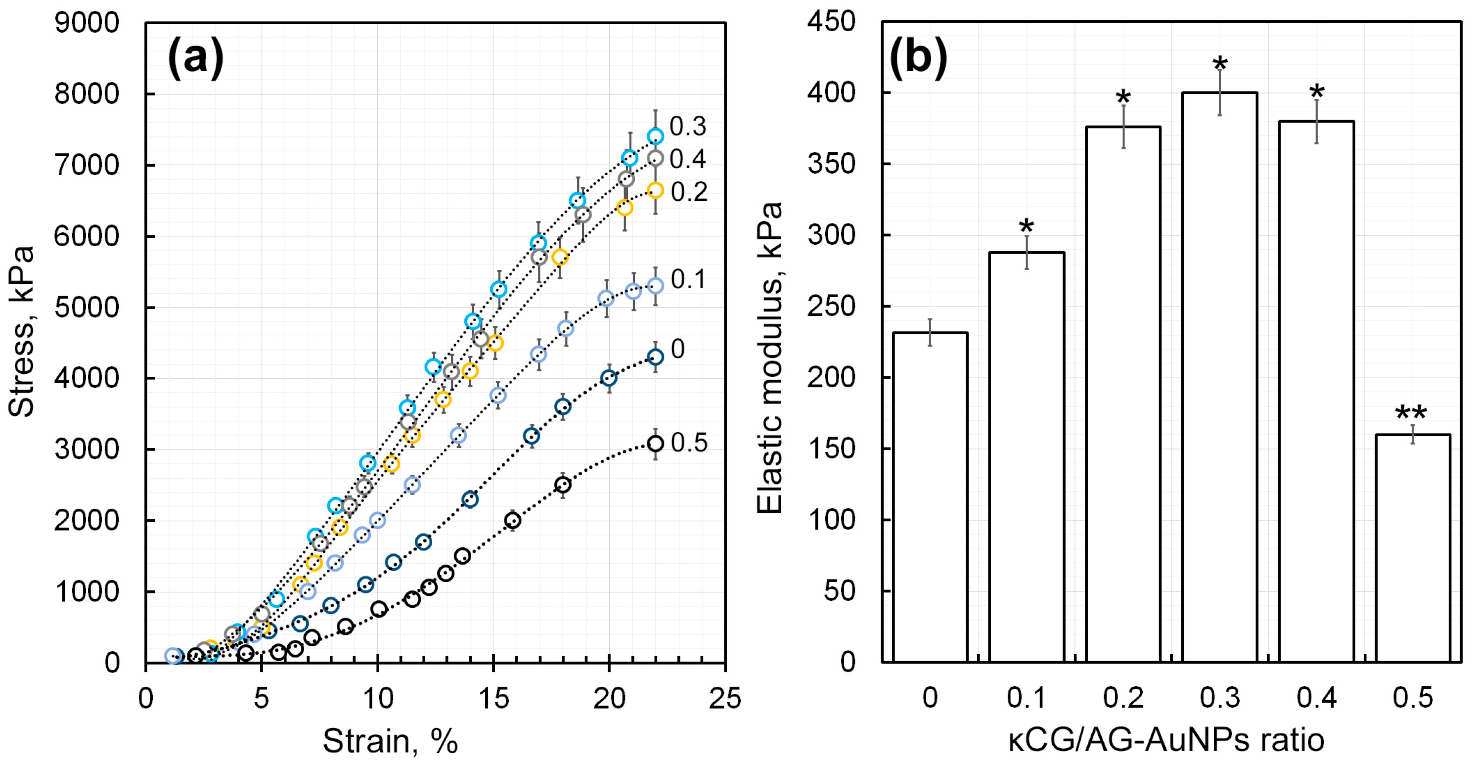 2.4. Creation and Characterization of Structural, Mechanical and Rheological Properties of Hydrogels Based on Ar-Gal-Stabilized AuNPs and κCG