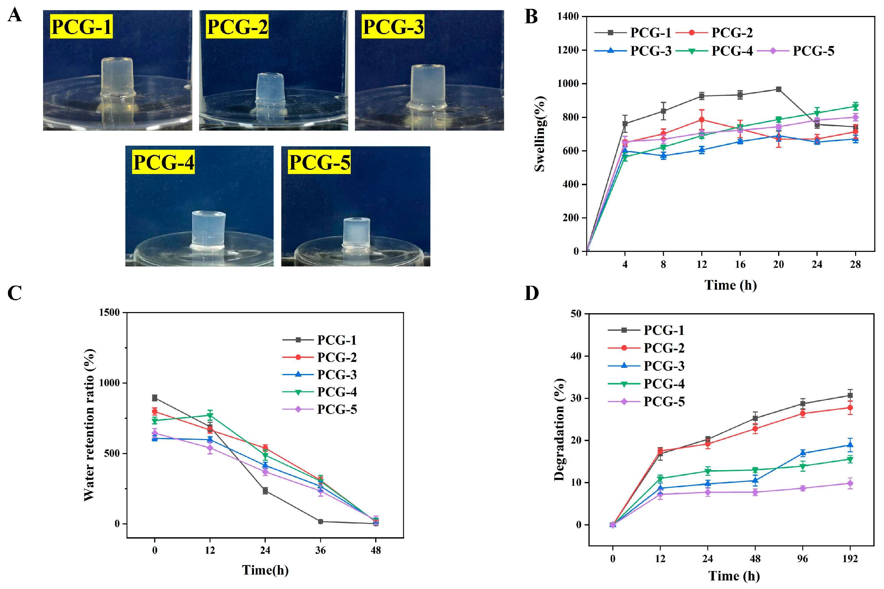 14], but it lost water rapidly (declining to 1.03 ± 1.1% at 48 h) as loose networks trap mostly evaporable free water and degraded fastest (28.7 ± 1.4% mass loss at 48 h) via exposed glycosidic bonds; in contrast, PCG-4 showed balanced performance—787.1 ± 16.2% swelling (24 h), 303.4 ± 40.3% water retention (48 h), and 15.4 ± 20.3% degradation (48 h)—a result of moderate β-glucan chain entanglement, which provides sufficient water infiltration space while stabilizing bound water via hydrogen bonding and reducing glycosidic bond exposure [