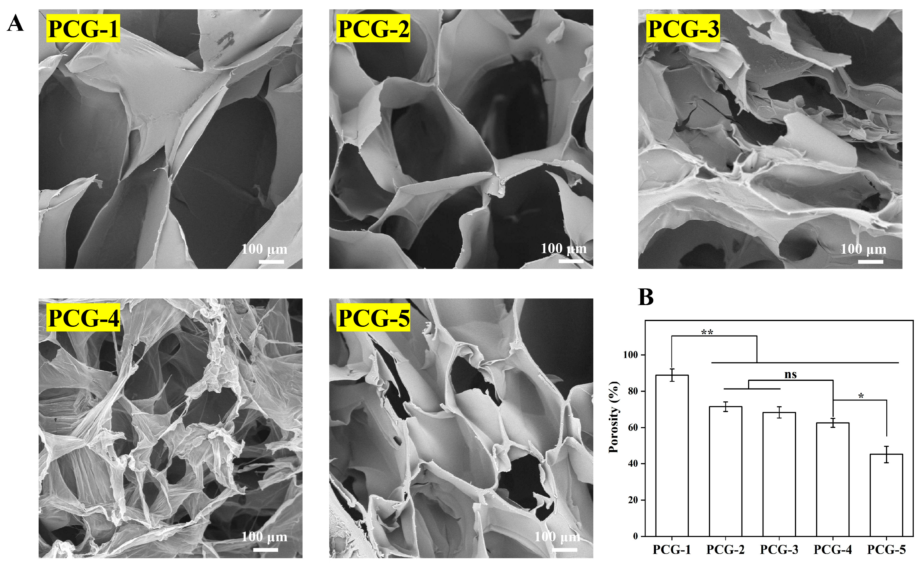 The microstructure of freeze-dried PCG-4 and PCG-TA hydrogel scaffolds was observed by SEM (SU8010, Hitachi, Japan). Before observation, the samples were cut into small pieces (5 mm × 5 mm × 2 mm) and sputter-coated with a thin layer of gold to improve electrical conductivity. The observation was performed under an accelerating voltage of 5 kV, and images of the surface and cross-section of the scaffolds were captured to analyze the pore morphology and distribution.