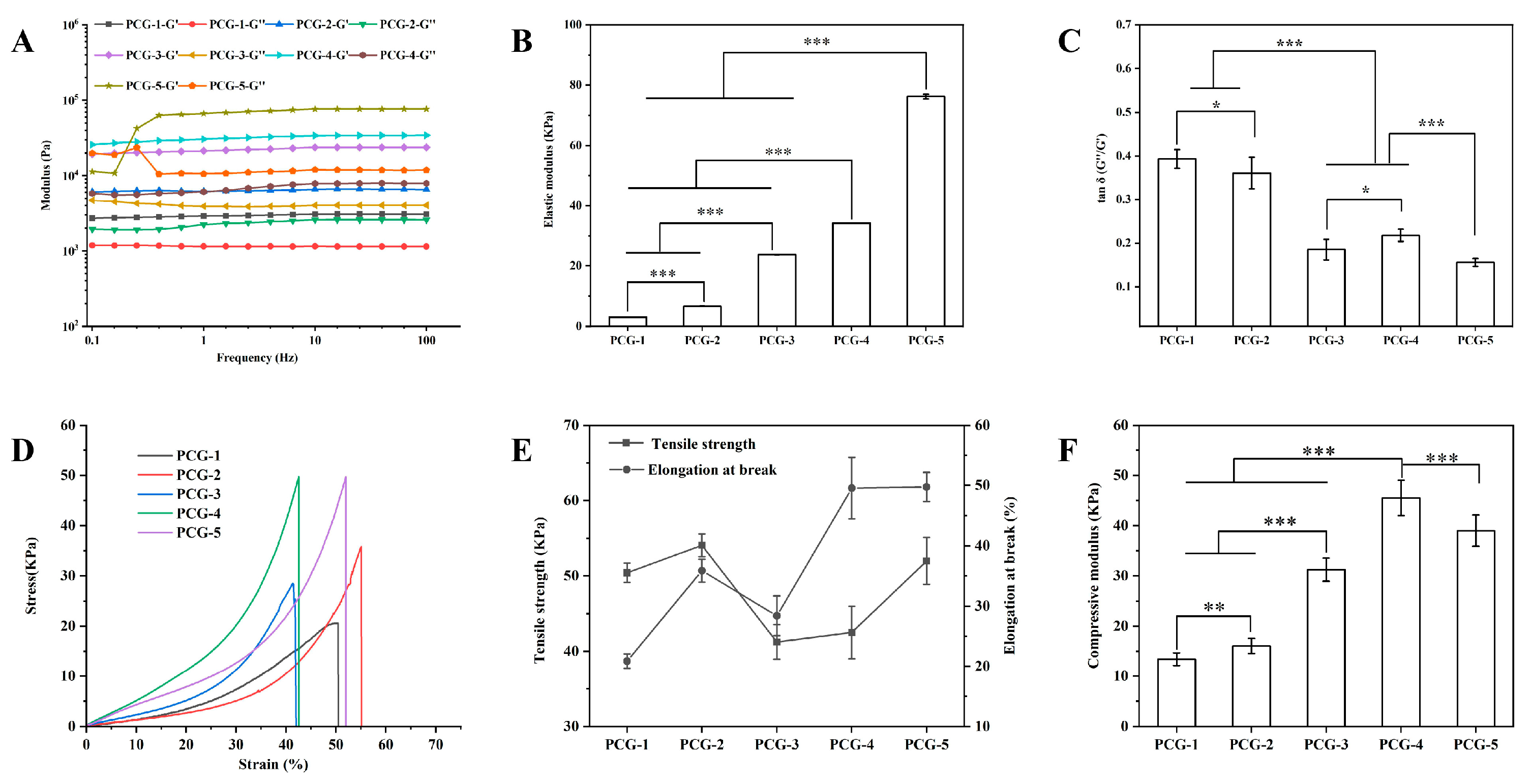 Figure 3C) remained <1 (indicative of elastic dominance) and higher than PCG-5 (tanδ = 0.156 ± 0.009). This suggests PCG-4 avoids the brittleness of PCG-5, as moderate tanδ values indicate a balance between elastic rigidity and viscous dissipation—essential for adapting to wound surface deformation without fracture [