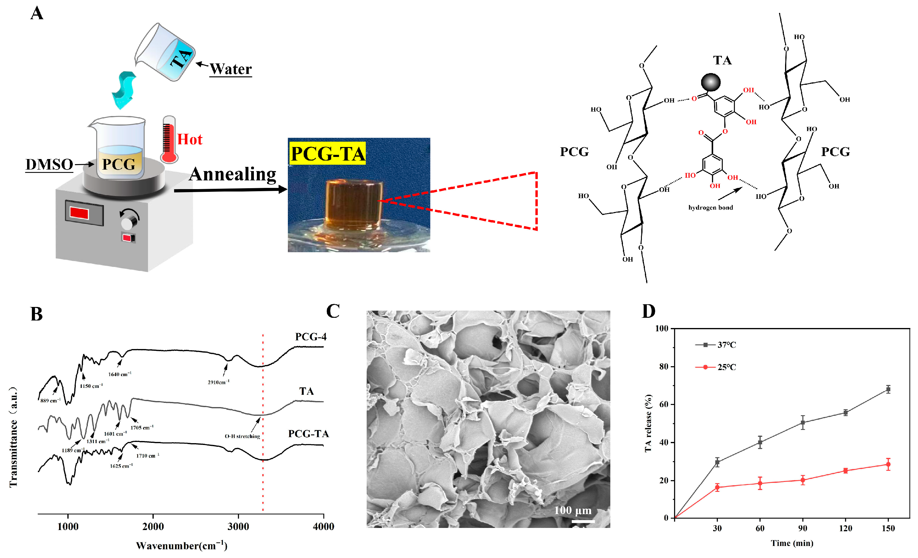 Using the optimal PCG-4 matrix as the base, a PCG-TA composite hydrogel with a PCG/TA weight ratio of 1:1 was prepared. Firstly, 10 mL of 4 wt.% PCG/DMSO solution (prepared as described in