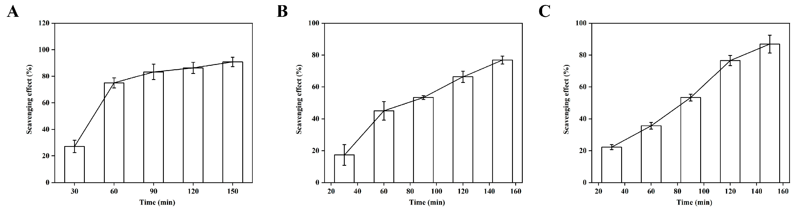 Figure 5): DPPH scavenging increased from 27.27 ± 4.6% (30 min) to 90.91 ± 3.5% (150 min), superoxide anion from 17.27 ± 6.5% to 76.91 ± 2.5%, and hydroxyl radical from 22.27 ± 1.5% to 86.9 ± 5.6%. This consistency confirms TA’s polyphenolic groups retain free radical-neutralizing activity post-loading, as hydrogen bonding with PCG avoids structural denaturation of TA’s active sites [