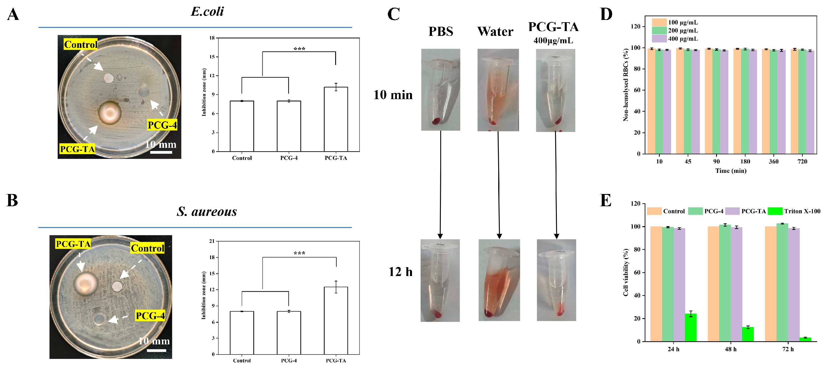 Figure 5C) exhibited significant hemolysis, evident from its red supernatant, while PCG-TA maintained a clear supernatant with no obvious hemolysis.