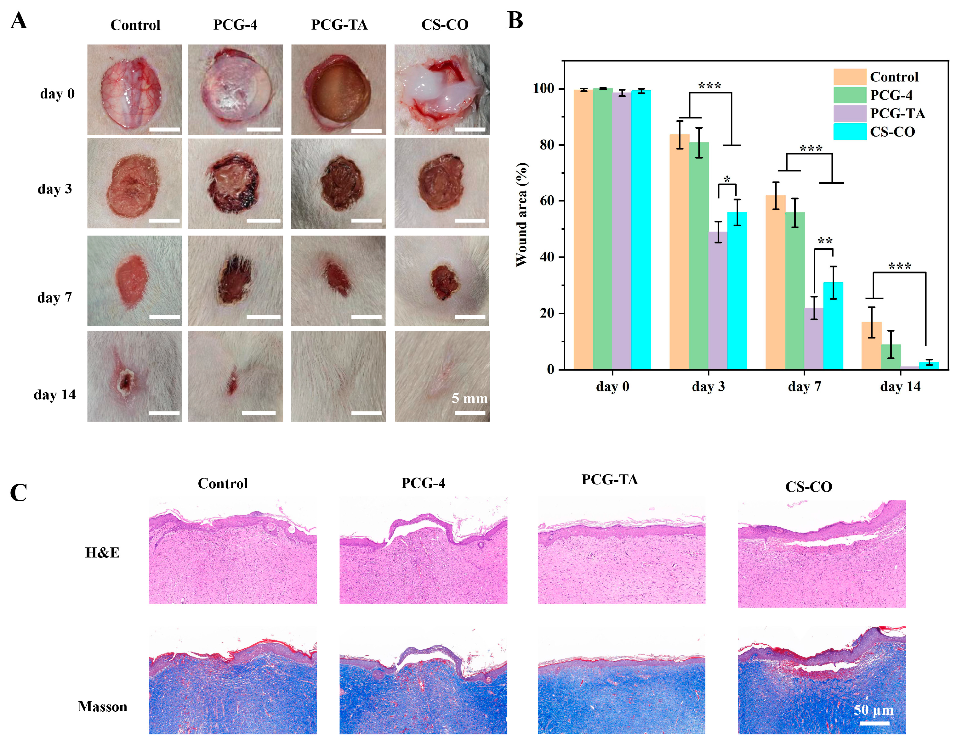 The in vivo wound healing efficacy of PCG-TA was evaluated via murine full-thickness wound models, with control (untreated), PCG-4, and CS-CO (positive control) as references (