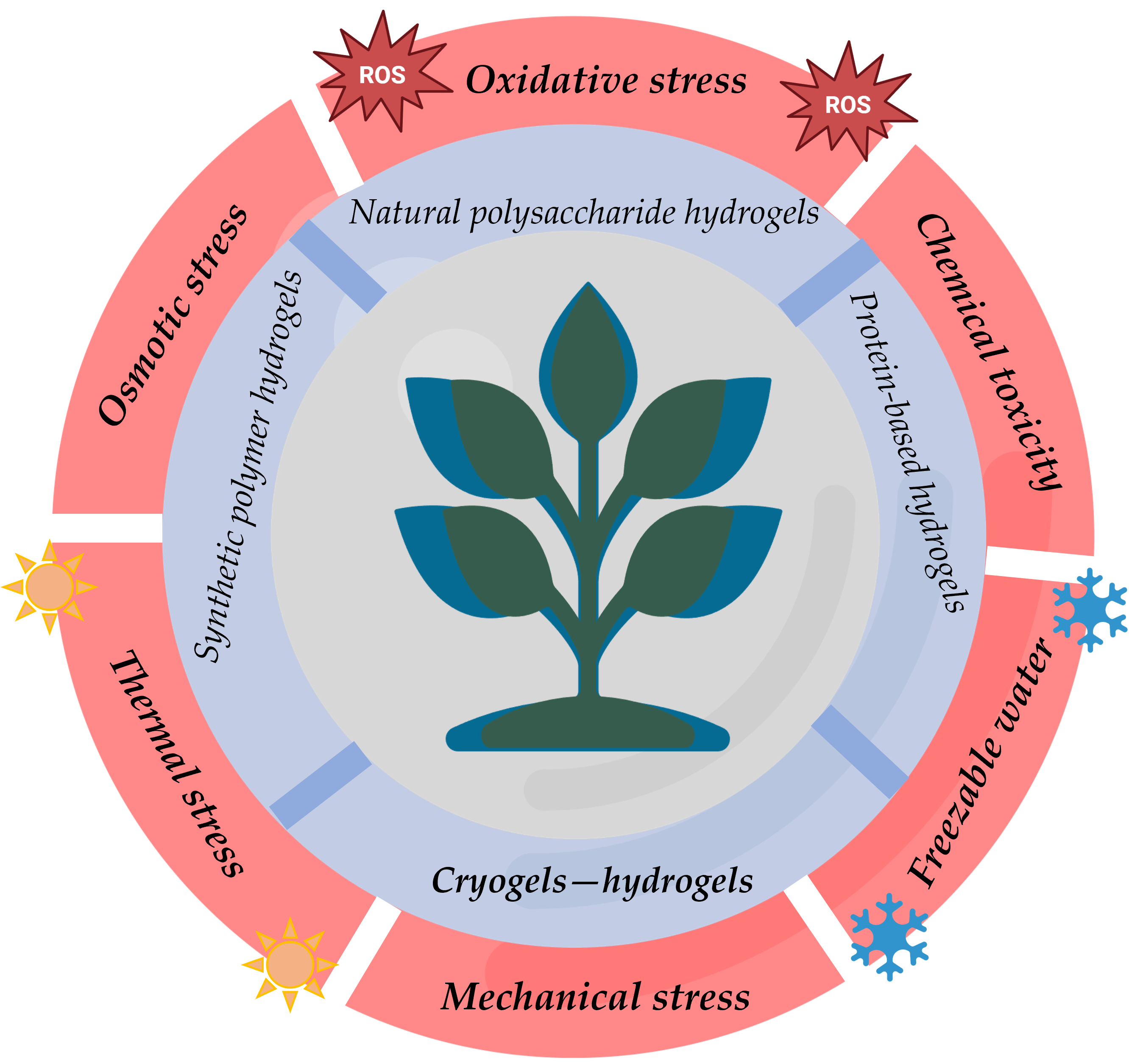 | Protein-based hydrogels | Gelatin; silk fibroin; collagen | Physical (thermal) or chemical crosslinking | Elastic networks; thermoresponsive behavior; moderate water binding capacity | Mechanical stress buffering; potential temperature-responsive diffusion | High elasticity; good energy dissipation | Batch variability; limited validation in plant systems | Li et al. [23]; Lin et al. [24]; Onder et al. [25]; Wang et al. [50]; Liu et al. [51] |