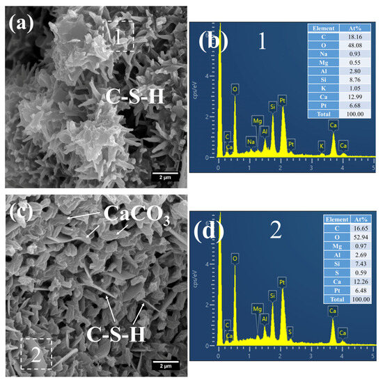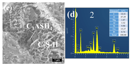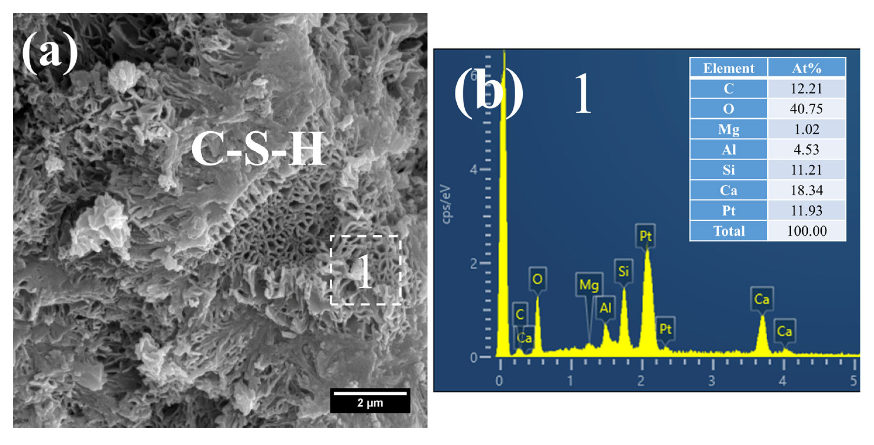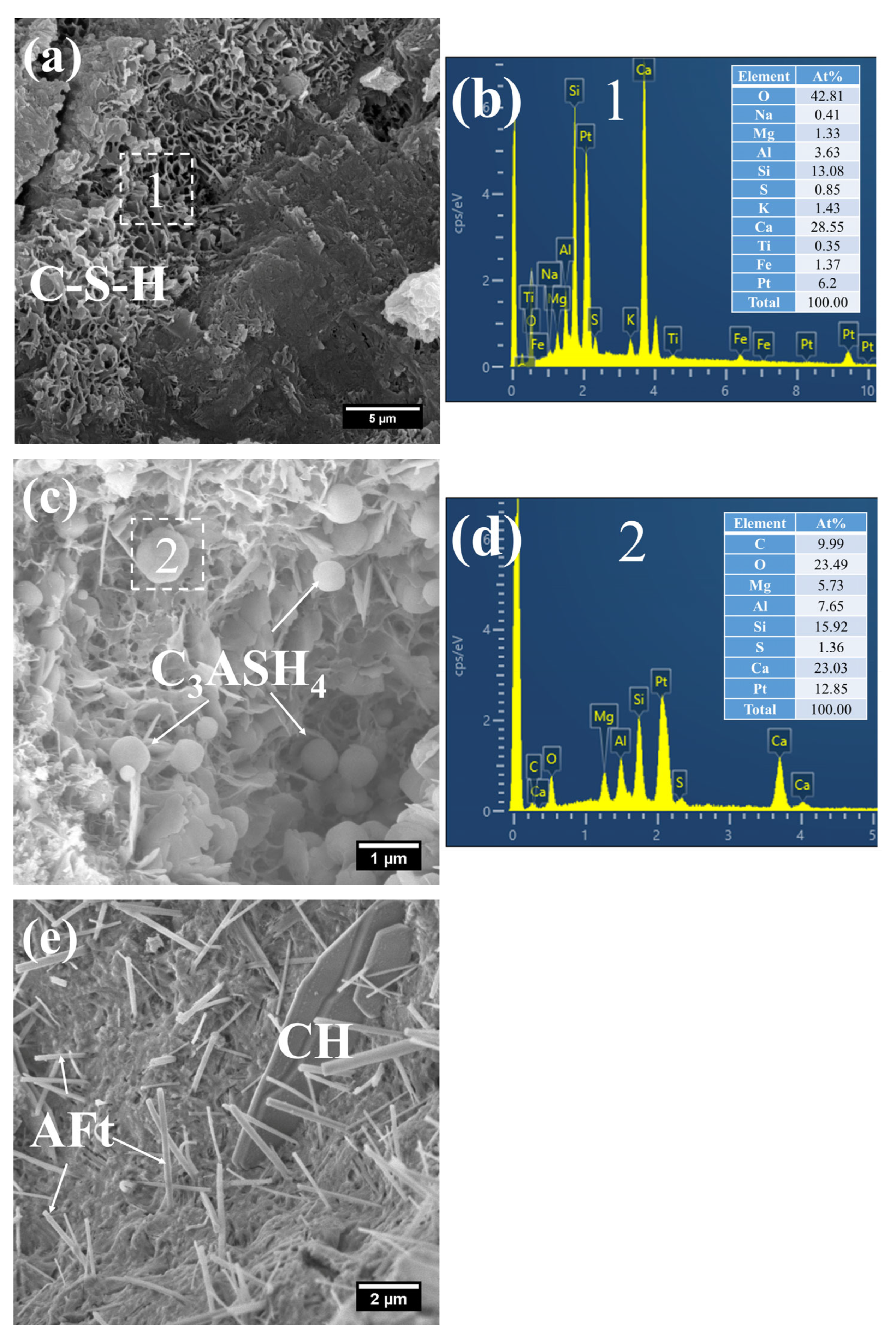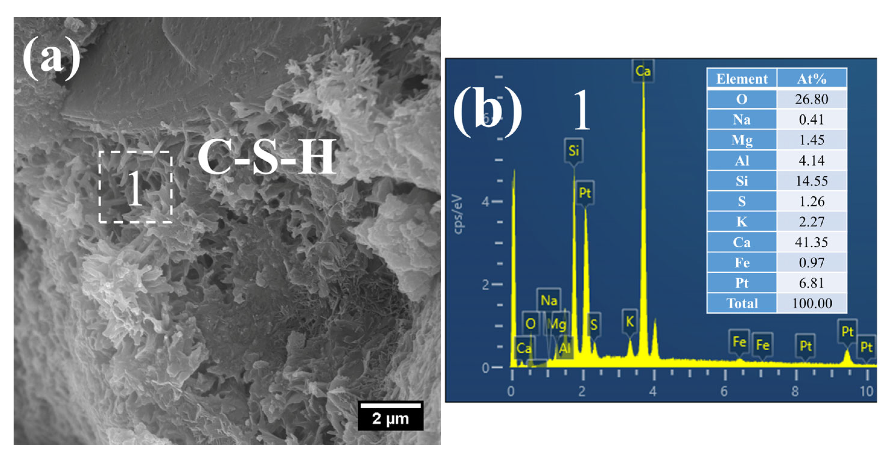 - At the three-day curing age, the C–S–H gels of steam-cured mortar not only exhibited relatively high Ca/Si and Al/Si ratios but were also accompanied by calcium hydroxide crystals with a coarser grain size. However, the incorporation of GBFS was able to mitigate this phenomenon. In addition, GBFS also altered the early-age morphology of C–S–H from spherical honeycomb of short, interwoven fibers in pure cement paste to porous, flake-overlapping honeycomb structures in GBFS-modified pastes.