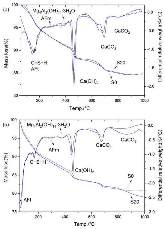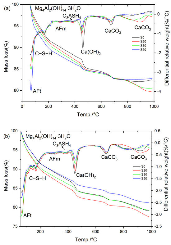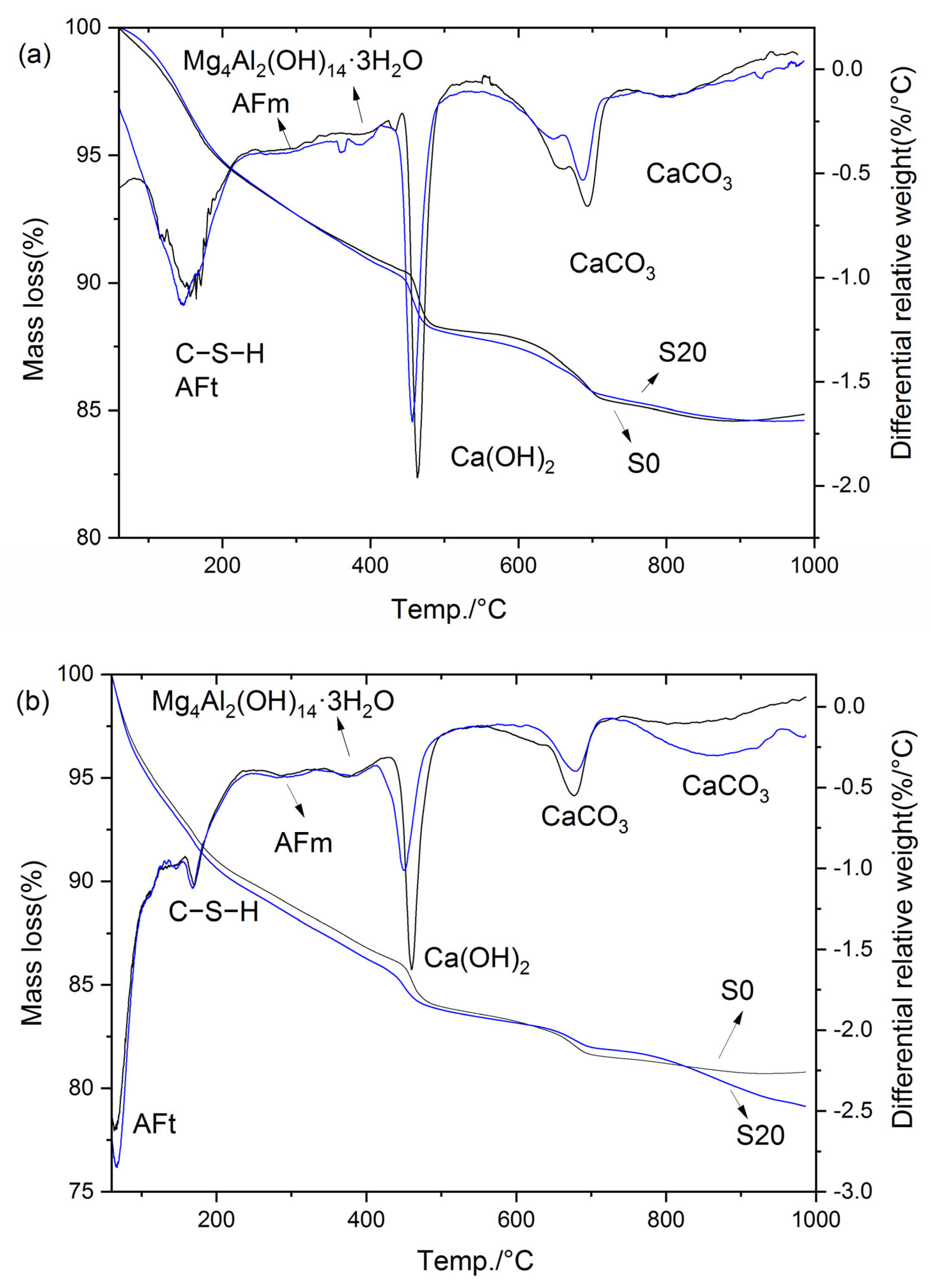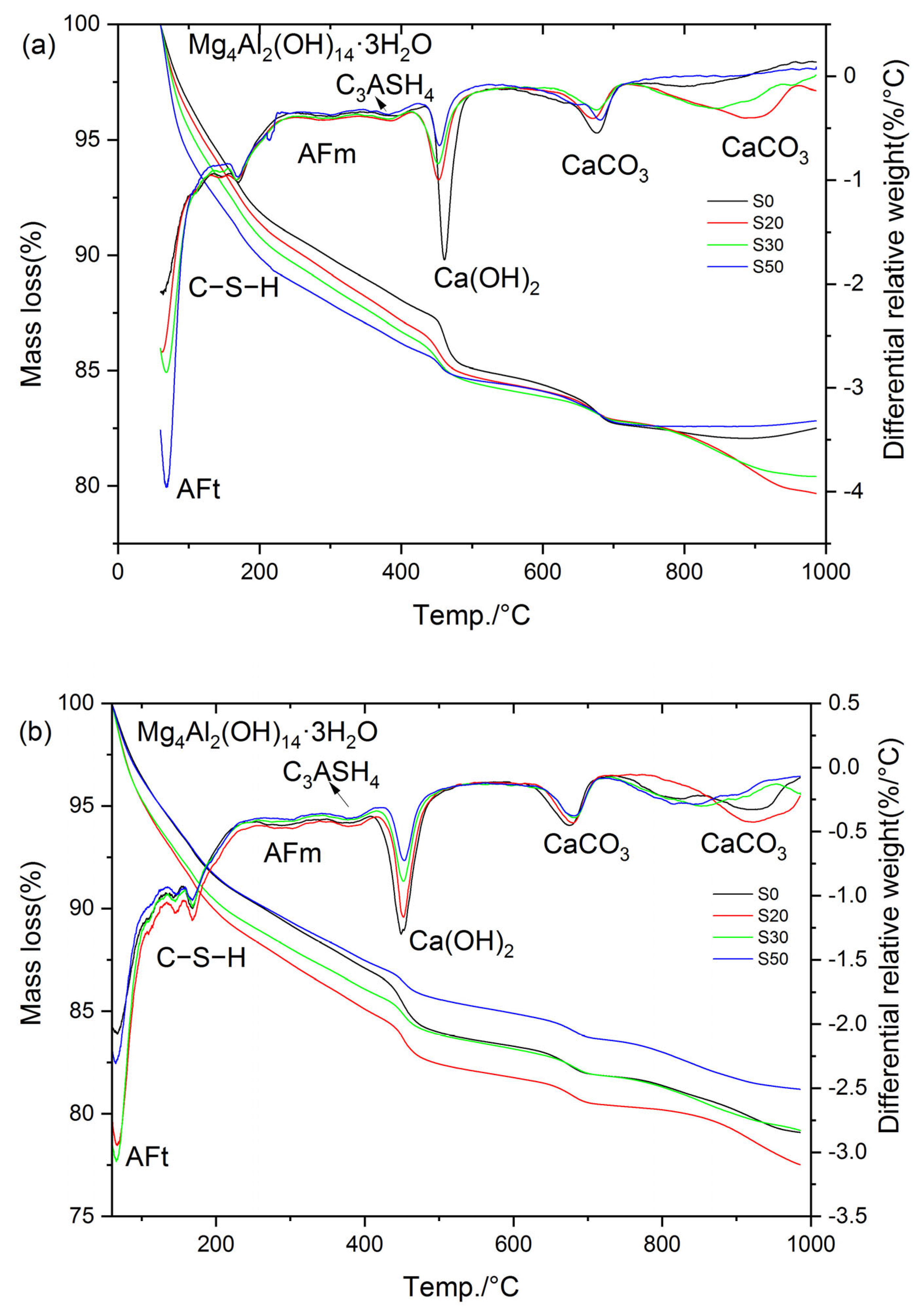 | Samples | Curing Age | Total Mass Loss | <80 °C | 80~240 °C | 330~410 °C | CH | Non-Evaporable Water |