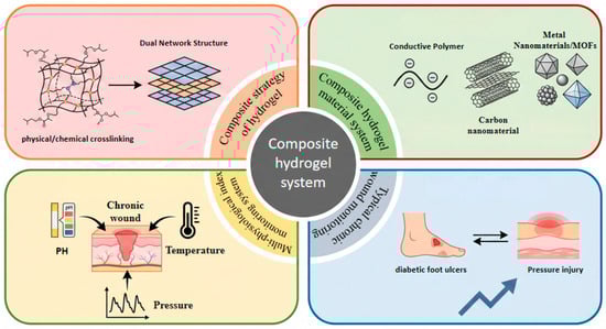 To overcome the performance limitations of single-component materials, the development of composite hydrogels has become a central strategy in current research on smart dressings [11]. Composite hydrogels are not simply physical mixtures of materials; instead, they are designed following function-oriented principles. Through physical blending, chemical cross-linking, or the construction of dual-network structures, an organic integration between the hydrogel matrix and functional fillers is achieved [12,13]. These fillers include a wide variety of materials, such as conductive polymers, carbon nanomaterials, and metal nanoparticles or metal-organic frameworks (MOFs), which can transmit electrical signals and often combine antibacterial properties with catalytic activity [14]. Via the synergistic “matrix + filler” effect, the resulting composite hydrogel exhibits enhanced mechanical strength and tissue adhesion. Furthermore, they gain the ability to convert chemical or physical signals from the wound microenvironment into quantifiable electrical or optical signals [15]. Nevertheless, selecting suitable composite materials and combination strategies to optimize hydrogel performance remain a major research challenge in this field, especially since real-world biomedical applications are highly complex and place extremely stringent demands on the properties of composite hydrogels [16].