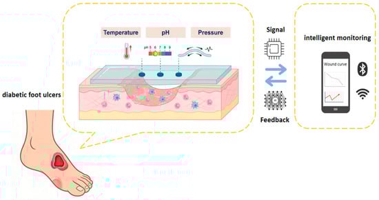 Real-time dynamic monitoring of key physiological and biochemical parameters is essential for managing the progression and healing of chronic wounds. As three core parameters with clear clinical relevance, pH, local temperature, and interface pressure together form the monitoring basis of an intelligent wound evaluation system [97]. Changes in pH are directly related to the microenvironmental conditions that favor microbial proliferation and biofilm formation, serving as an early indicator of infection risk. Local tissue temperature reflects the metabolic activity of inflammatory cells and provides a reliable thermal signal of the magnitude of the clinical inflammatory response. Interface pressure is a key mechanical variable to realize the early warning of stress injury risk. Real-time dynamic monitoring of physiological parameters is crucial for managing the pathological evolution and healing of chronic wounds. pH, local temperature, and pressure—three well-defined, clinically relevant indicators, serve as the foundation for intelligent wound assessment systems. However, the chronic wound microenvironmen is highly complex and dynamic. Changes in a single parameter are often influenced by multiple factors, rendering it insufficient to provide a comprehensive assessment of wound status [98]. For example, elevated pH levels may indicate bacterial infection, but can also be affected by exudate composition, tissue necrosis, or local metabolic activity. Similarly, localized temperature changes may reflect inflammation, but are also associated with factors such as blood perfusion and ambient temperature. Relying solely on a single parameter thus carries a risk for misinterpretation. A comprehensive and accurate wound assessment requires multi-parameter monitoring, cross-validation, and integration with clinical manifestations.