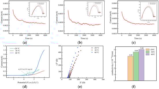 (a–c) DC polarization curves of the battery at −20 °C, 30 °C, and 60 °C when the polarization voltage is 10 mV. (Inset: Simulated equivalent resistance and impedance spectra of symmetrical cells before and after polarization.) (d) Linear voltammogram of gel polymer electrolyte. (e) Impedance plots of the gel polymer electrolyte at different temperatures. (f) Bar graph comparing conductivity at different temperatures.