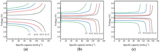 Figure 3a–c, respectively, show the initial charge–discharge curves of the battery (with lithium iron phosphate as the positive electrode and lithium sheets as the negative electrode) when charged and discharged at different rates at different temperatures. Due to the continuous extraction/insertion of lithium ions from the active material, the initial charge–discharge curve presents a typical smooth monotonic voltage plateau. At the same current density, the higher the operating temperature of the battery, the higher the discharge capacity and the smaller the polarization of the battery. This shows that at a certain temperature range, the performance of the battery improves with the increase in temperature.