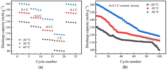 Figure 4a shows the rate characteristics of the batteries at different temperatures. It can be seen from the figure that the specific capacity of the battery decreases with the increase in current density at 0.1 C, 0.2 C, 0.5 C, 1 C, and 0.1 C current densities. When the current density is the same, the higher the temperature, the higher the charge–discharge specific capacity. For example, at a current density of 0.2 C, the specific discharge capacity is 136.7 mAh g−1 at 30 °C and 151.6 mAh g−1 at 60 °C.