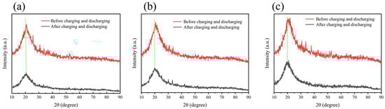 Figure 5 shows X-ray diffraction (XRD) patterns of GPE before and after charging and discharging. It can be seen from Figure 5 that the position of the characteristic diffraction peak of GPE after charge and discharge is earlier than that before charge and discharge. This is due to the weakened coordination relationship between lithium ions and polymers and the resulting relaxation of the polymer structure/decrease in crystallinity. Partial extraction or redistribution of lithium ions can disrupt the coordination between Li+ and the polar sites of polymers, resulting in a reduction in the semi-crystalline region and an increase in the amorphous region. On XRD, this is manifested as a decrease in the intensity of diffraction peaks and slight peak shifts [34,35,36]. Diffraction peaks before charging and discharging have high crystallinity, a complete lattice, sharp diffraction peaks, and high intensity. After charging and discharging, the diffraction peak intensity decreases, and the peak width widens. By comparing the diffraction peaks at different temperatures, it can be seen that the diffraction peak at 60 °C has the highest intensity and the diffraction peak at −20 °C has the lowest intensity. This indicates that the performance of the electrolyte increases with the increase in temperature in a certain temperature range.