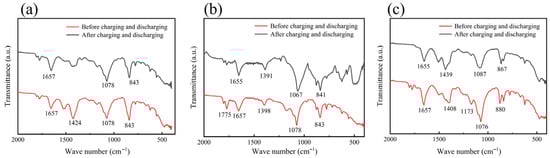 Figure 7 shows the Fourier Transform Infrared Spectroscopy (FTIR) of the gel polymer electrolyte before and after charging and discharging. As can be seen from Figure 7, the absorption peak of the electrolyte before charging and discharging is stronger and more distinct compared to the absorption peak of the electrolyte after charging and discharging. Even some absorption peaks only appear in the infrared spectrum of the electrolyte before charging and discharging, as shown in Figure 7a. In the infrared spectrum of the electrolyte before charging and discharging, there is a clear absorption peak at 1424 cm−1, but it is not present in the infrared spectrum of the electrolyte after charging and discharging. This is because the electrolyte structure before charging and discharging is intact and the functional groups are well retained, with high and clear infrared absorption peaks; while after charging and discharging, the electrolyte decomposes, its structure becomes disordered, and by-product formation occurs, resulting in a reduction or masking of the corresponding functional groups, thereby significantly weakening the absorption peak intensity [40,41,42]. The positions of the infrared spectra of the electrolyte before and after charging and discharging are also different. As shown in Figure 7b, in the infrared spectrum of the electrolyte before charging and discharging, an absorption peak appears at 1078 cm−1, while in the corresponding infrared spectrum of the electrolyte after charging and discharging, this absorption peak appears at 1067 cm−1. This is because after the performance decline, the electrolyte polymer chains are disrupted, the coordination structure changes, side-reaction products form, and the molecular environment alters. These factors cause the vibration frequency of chemical bonds to change, thereby resulting in a shift in the position of the absorption peak [43,44,45].