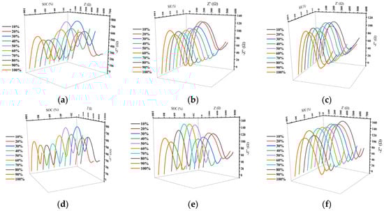(a,d) EIS diagrams of GPE before and after charging and discharging at −20 °C and different SOC conditions. (b,e) EIS diagrams of GPE before and after charging and discharging at 30 °C under different SOC conditions. (c,f) EIS diagrams of GPE before and after charging and discharging at 60 °C under different SOC conditions.