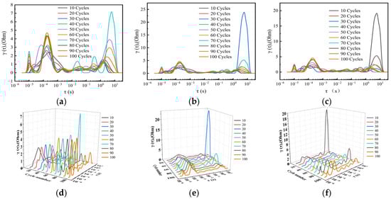 EIS diagrams: (a–c) battery DRT analysis at −20 °C, 30 °C, 60 °C. The three-dimensional evolution diagrams corresponding to (a–c) are shown in figures (d–f).
