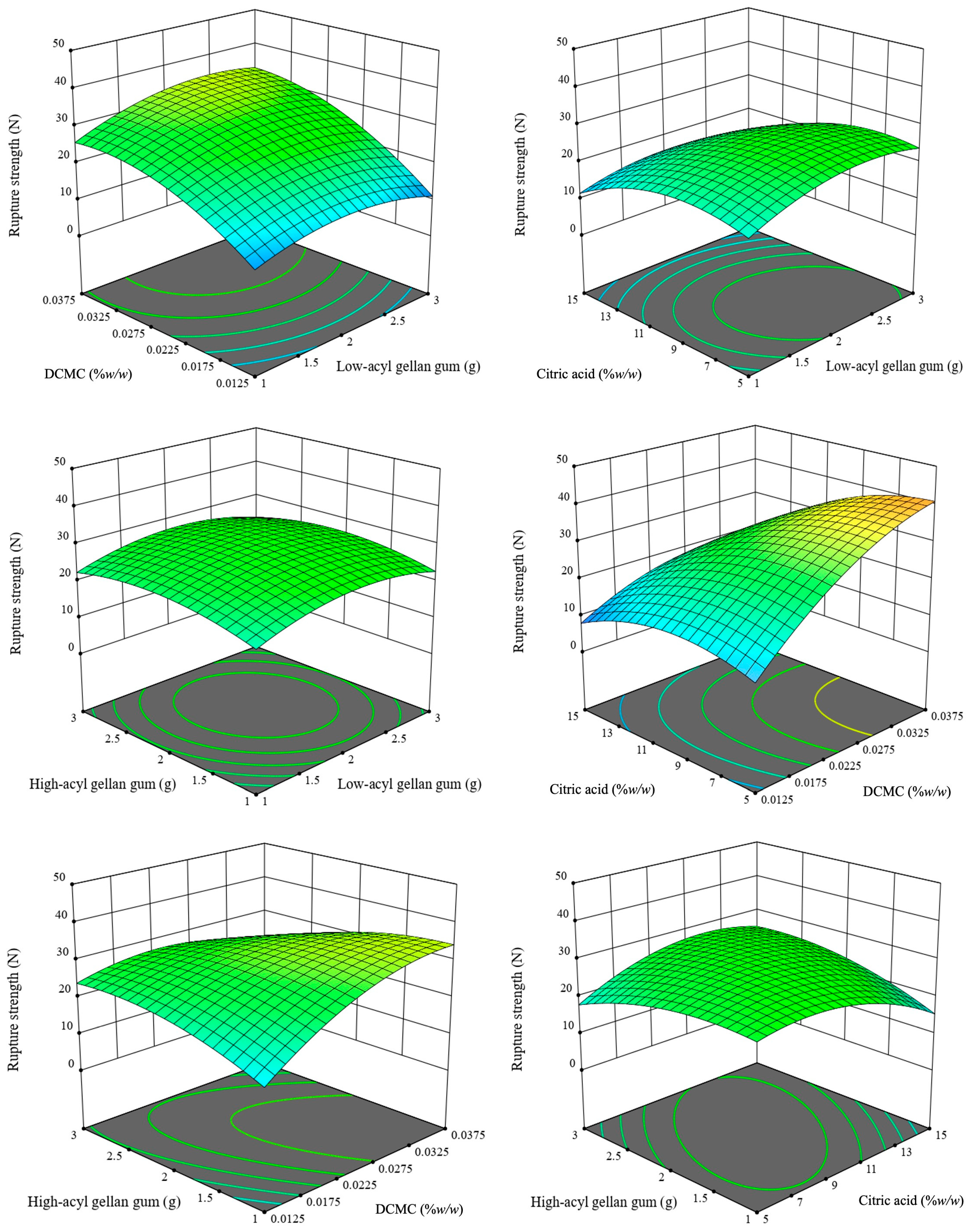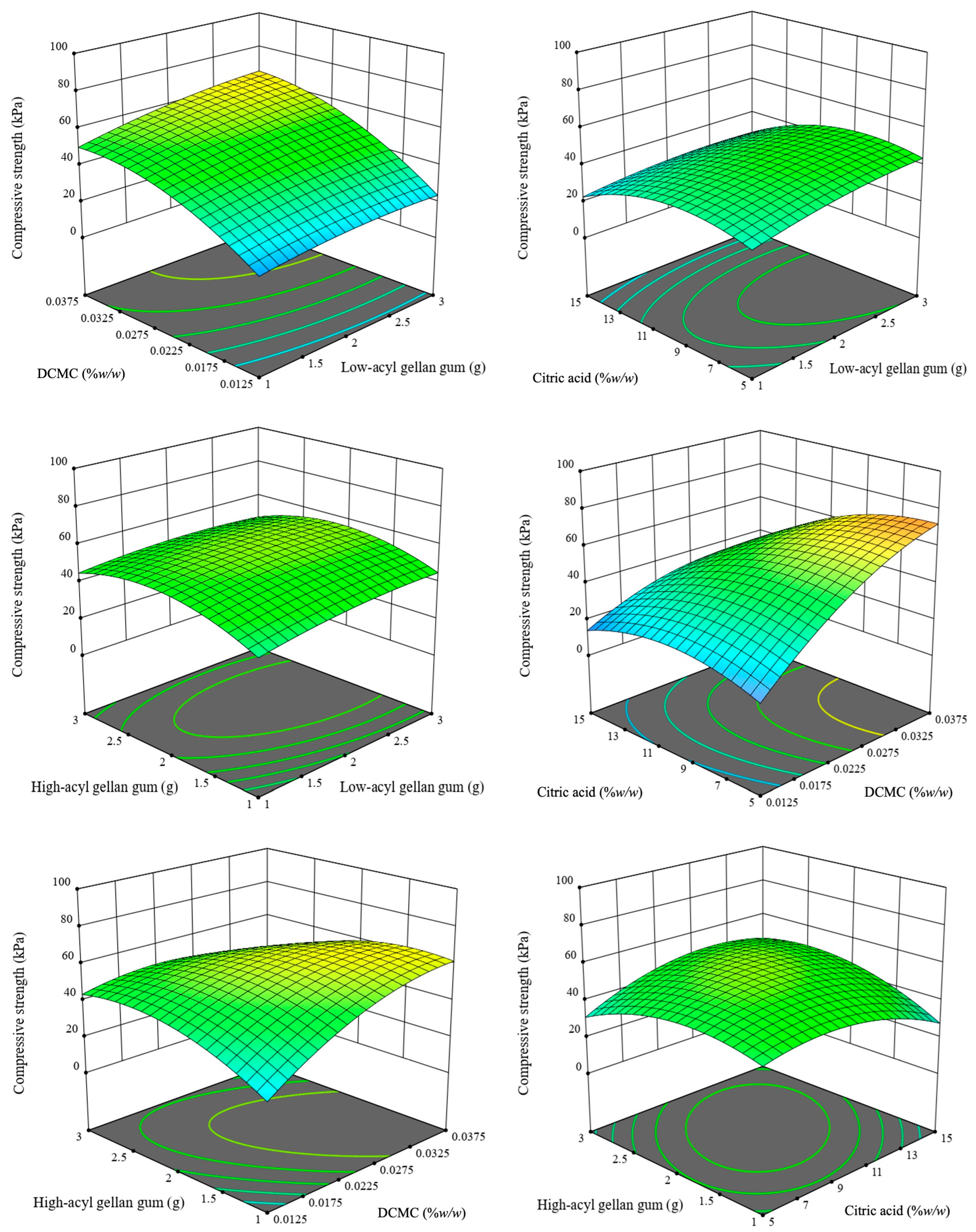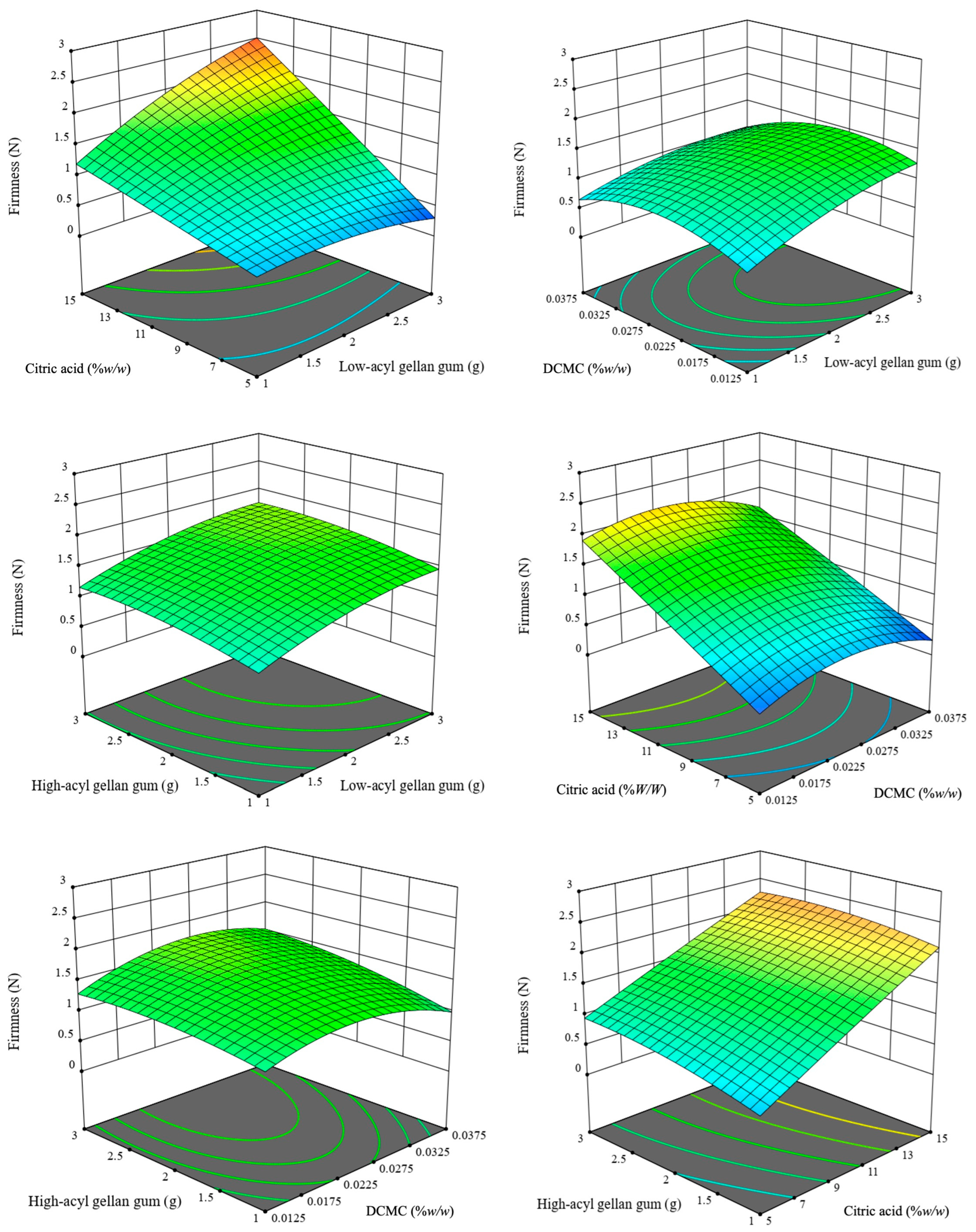 | Low-acyl Gellan Gum (g) | High-acyl Gellan Gum (g) | DCMC Concentration (%w/w) | Citric Concentration (%w/w) | Firmness (N) | Rupture Strength (N) | Compressive Strength (kPa) | ||||