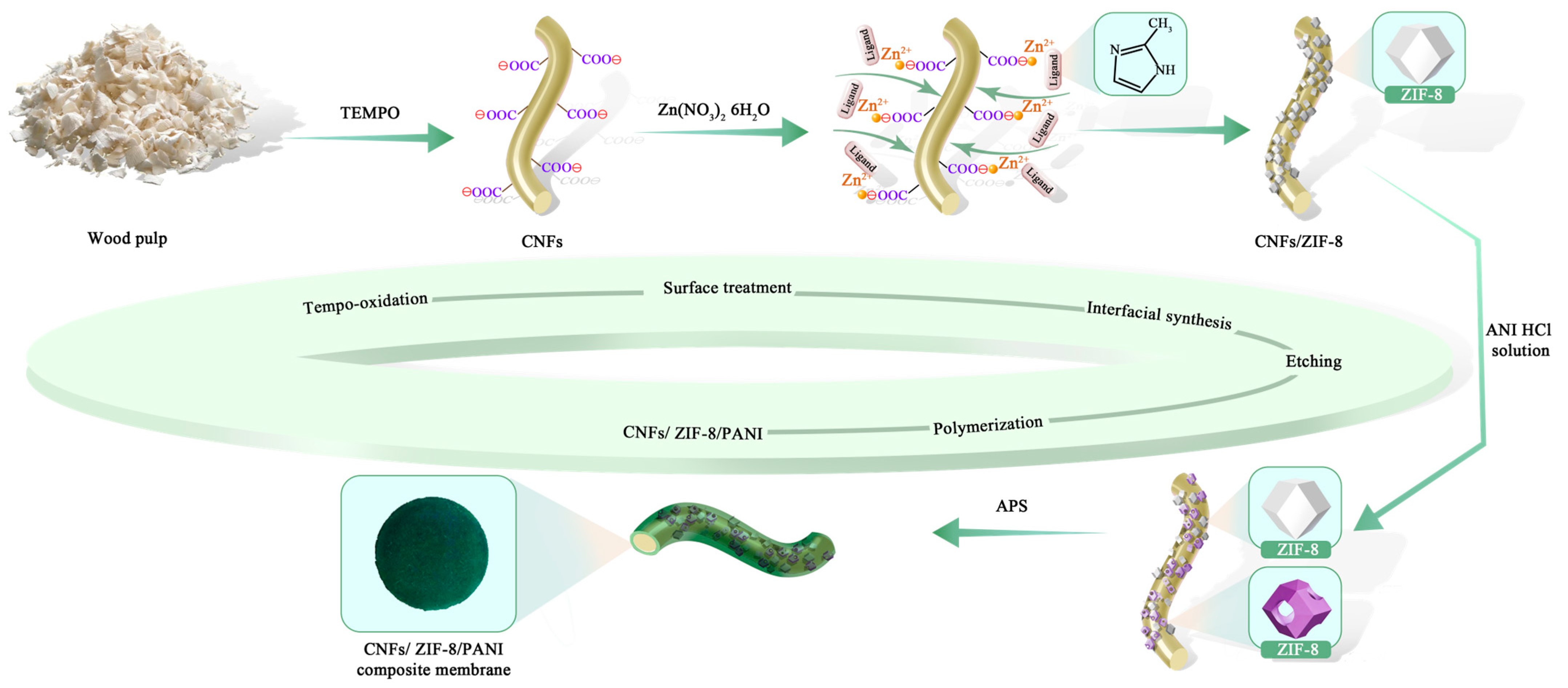 2O and organic ligand 2-methylimidazole(MI) was incorporated into the ion-exchanged CNFs suspension to drive the assembly of ZIF-8. A uniformly dispersed CNFs/ZIF-8 nanofiber suspension was finally achieved. Furthermore, PANI was deposited onto the surface of CNFs/ZIF-8 via in situ polymerization. Ultimately, freestanding CNFs/ZIF-8/PANI gel composite membranes were obtained via vacuum filtration through a filter membrane. Detailed experimental procedures for all steps are described in