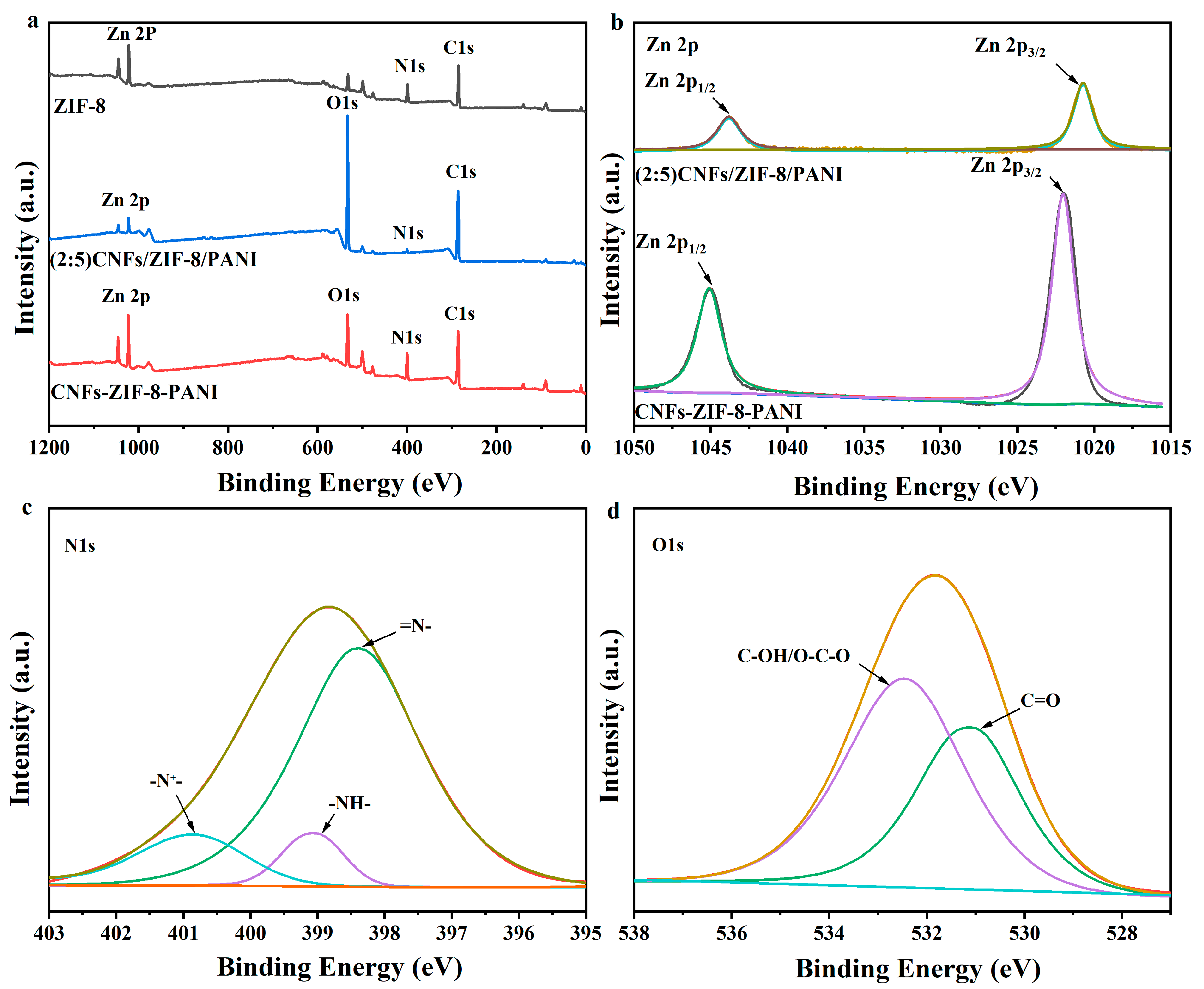 2 in CNFs-ZIF-8-PANI are located at 1045 eV and 1021.7 eV, respectively, which are consistent with the peak positions of Zn 2p in pure ZIF-8. In contrast, the binding energy peaks of Zn 2p