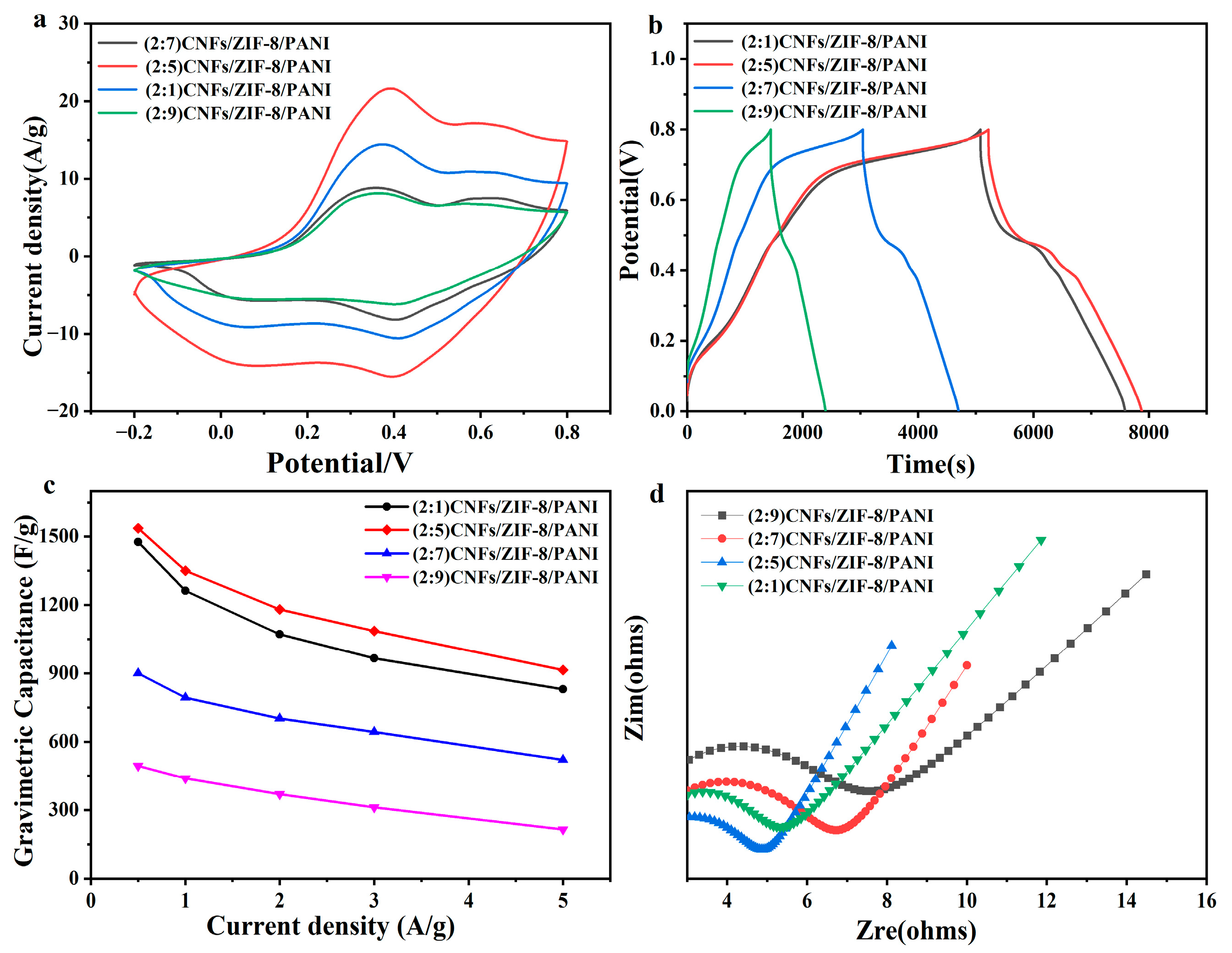 When the ratio of CNFs to ZIF-8 is 2:5, the CV curve area is significantly larger than those with other ratios. This is further confirmed by the triangular peak shape observed in the GCD curve (