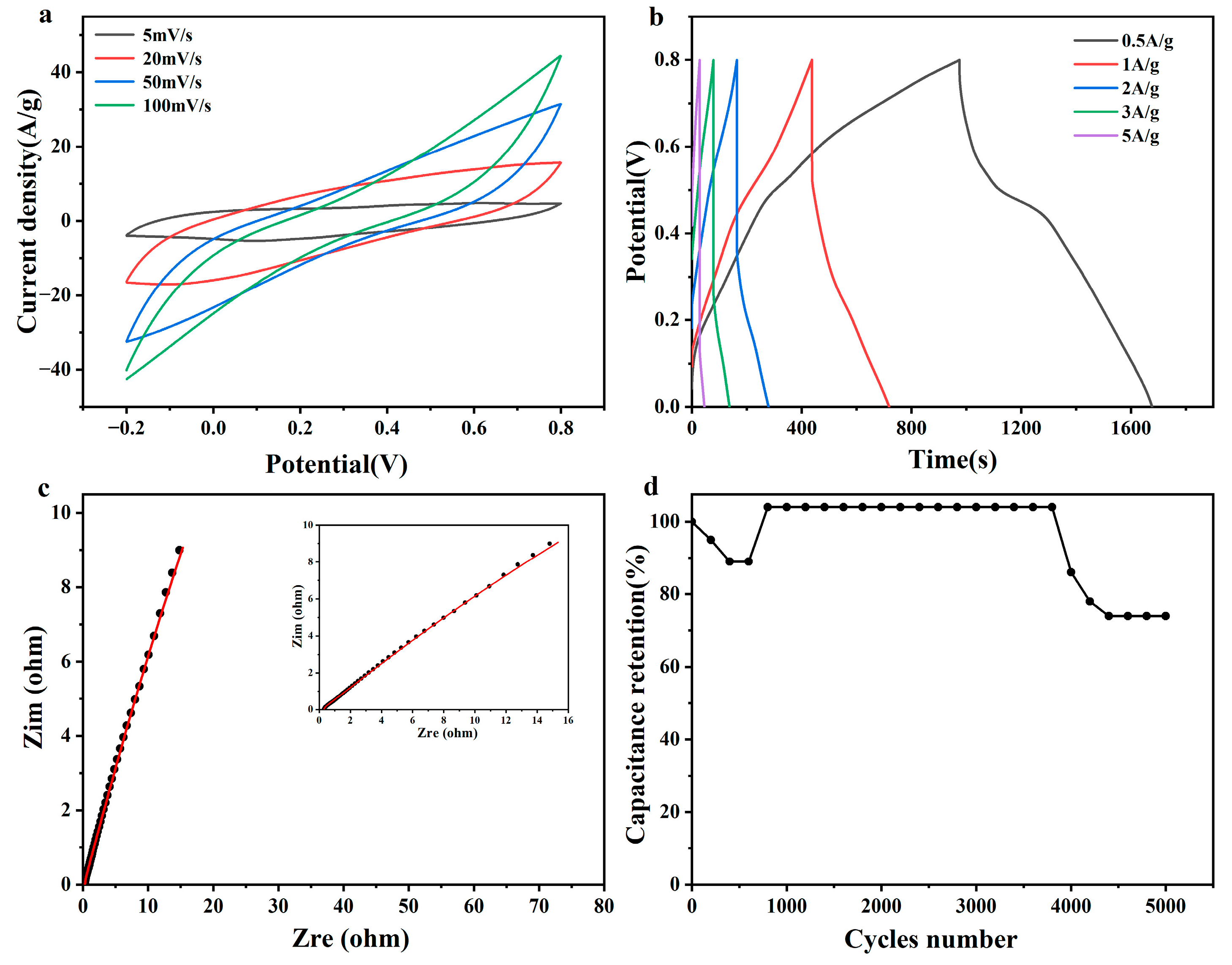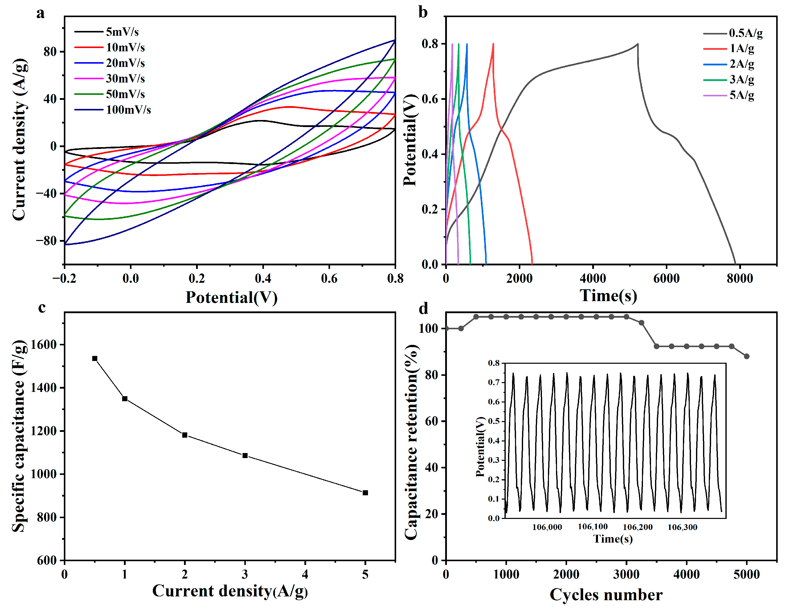 The GCD measurements were conducted within a voltage window of 0 to 0.8 V, at constant current densities ranging from 0.5 to 5 A/g. CV measurements were implemented within the identical potential range, with scan rates varying from 5 to 100 mV/s.