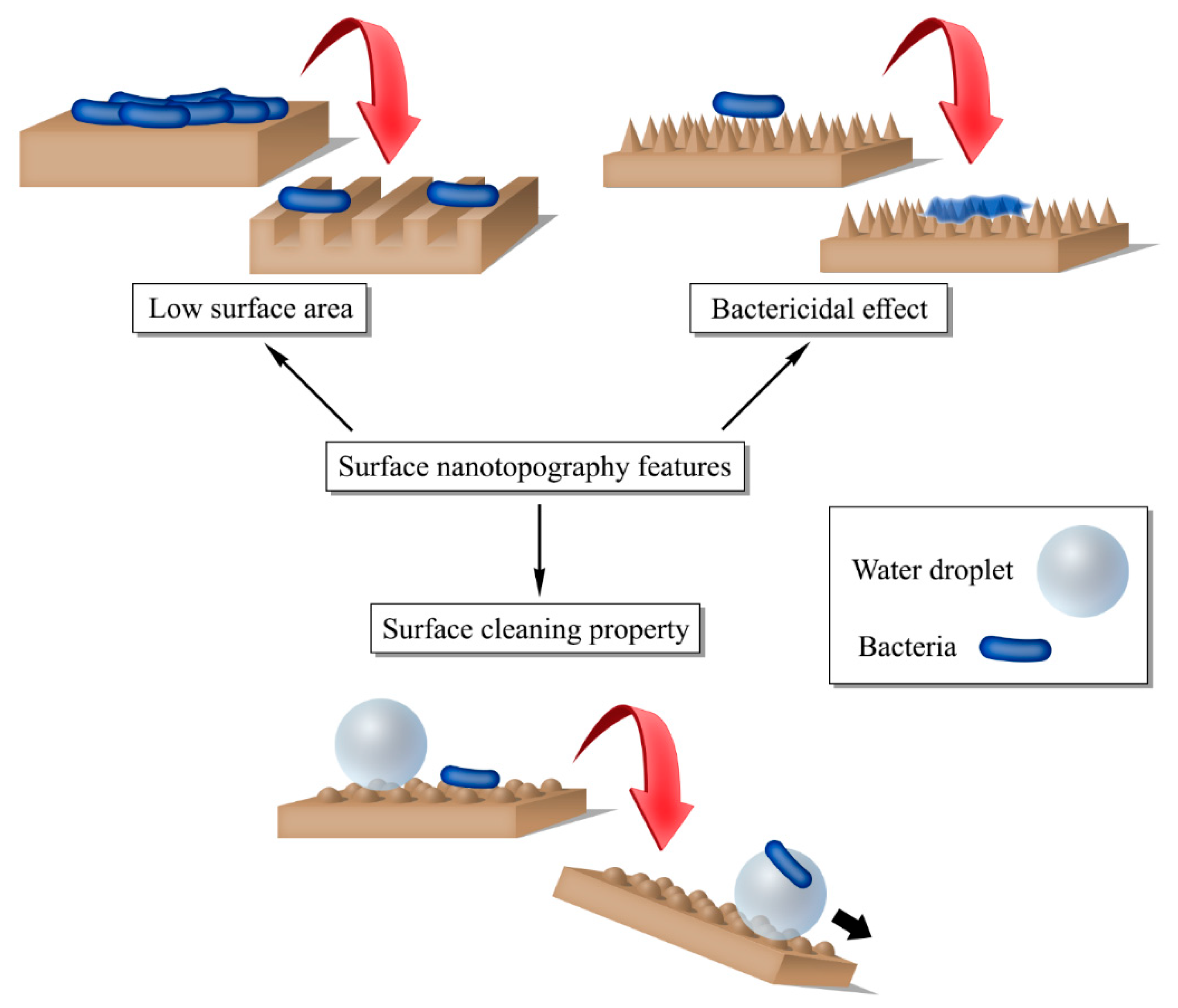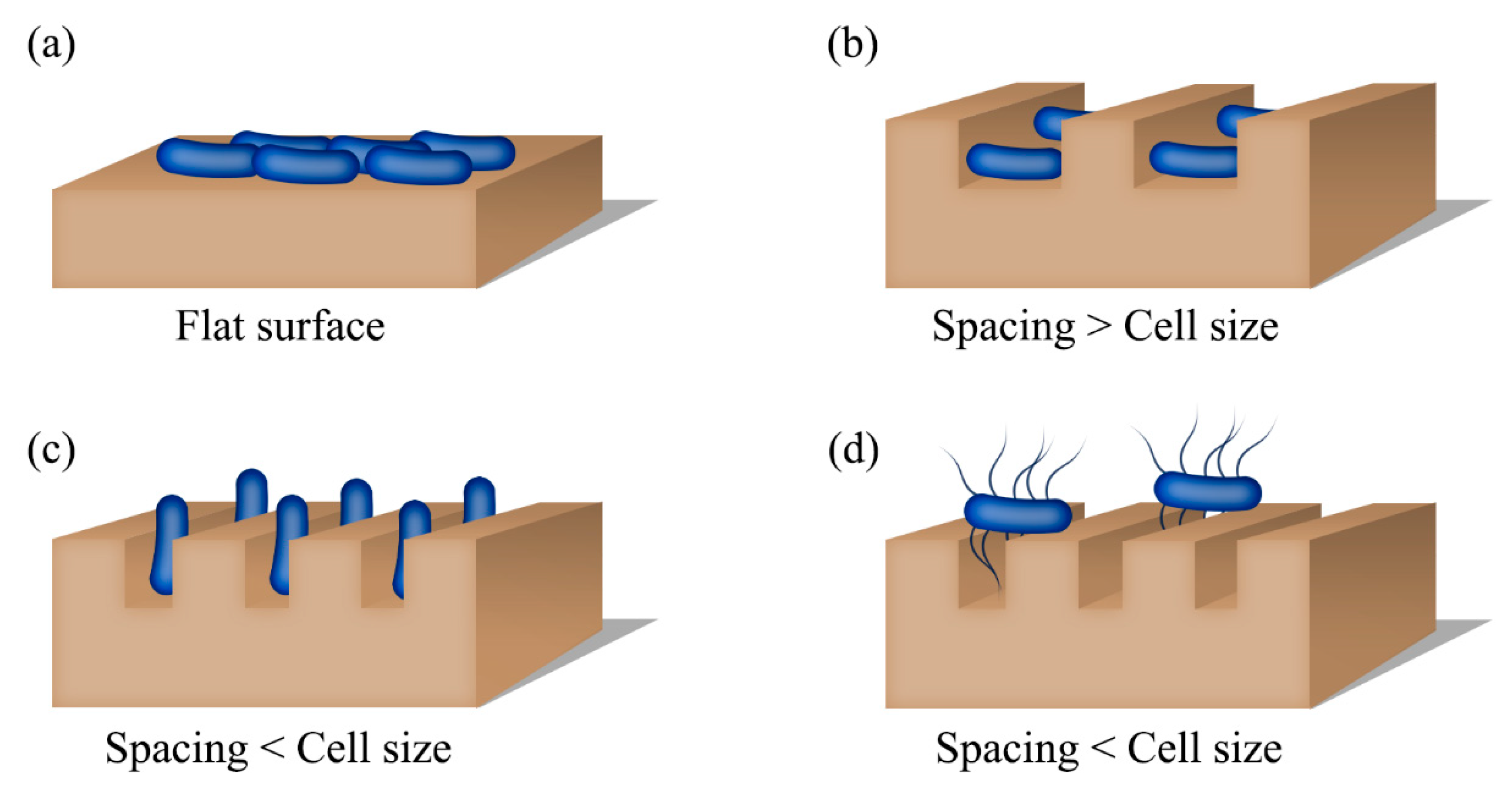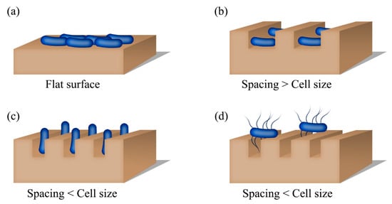 - Cheng, Y.; Feng, G.; Moraru, C.I. Micro- and Nanotopography Sensitive Bacterial Attachment Mechanisms: A Review. Front. Microbiol. 2019, 10, 191. [Google Scholar] [CrossRef] [PubMed]