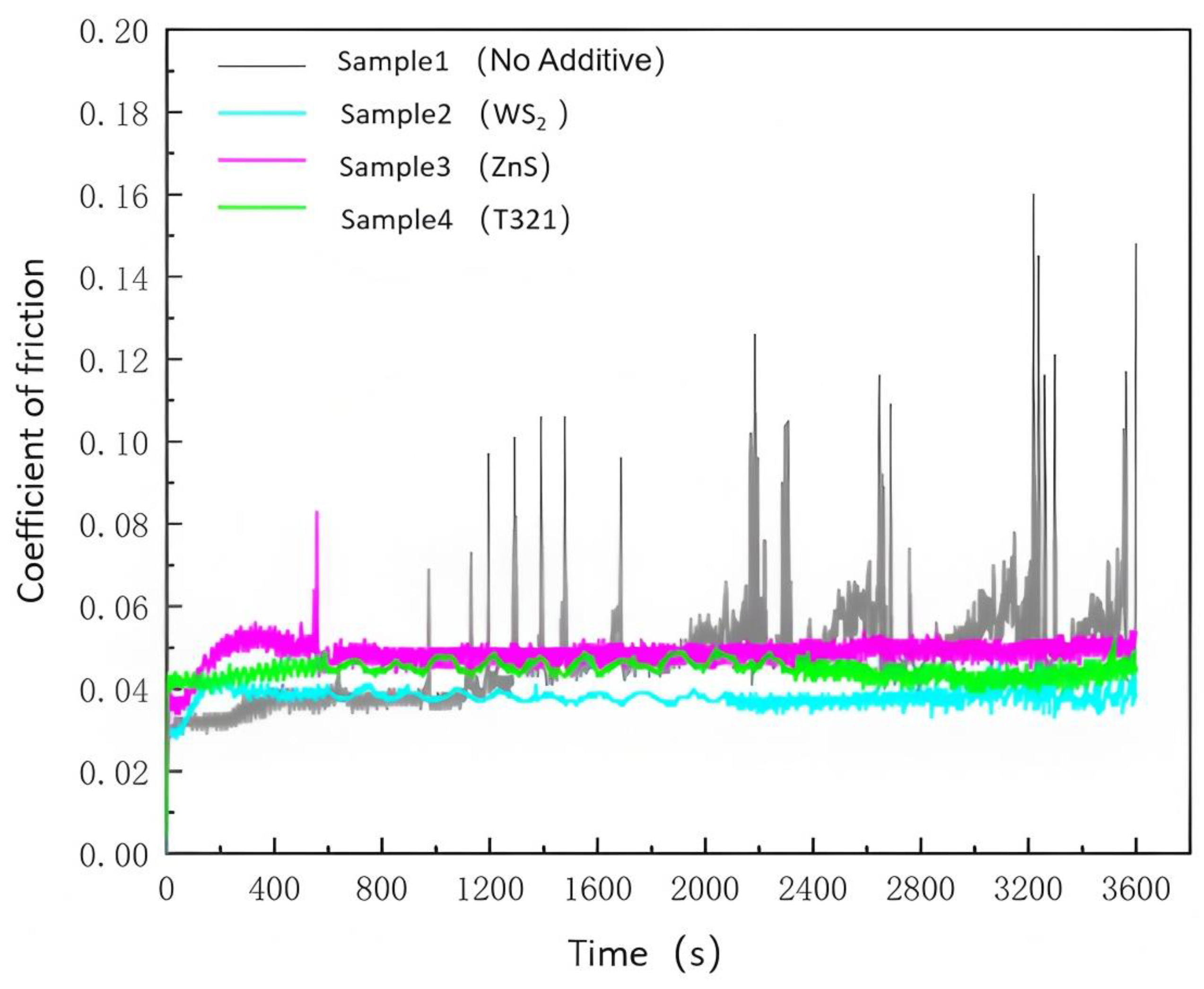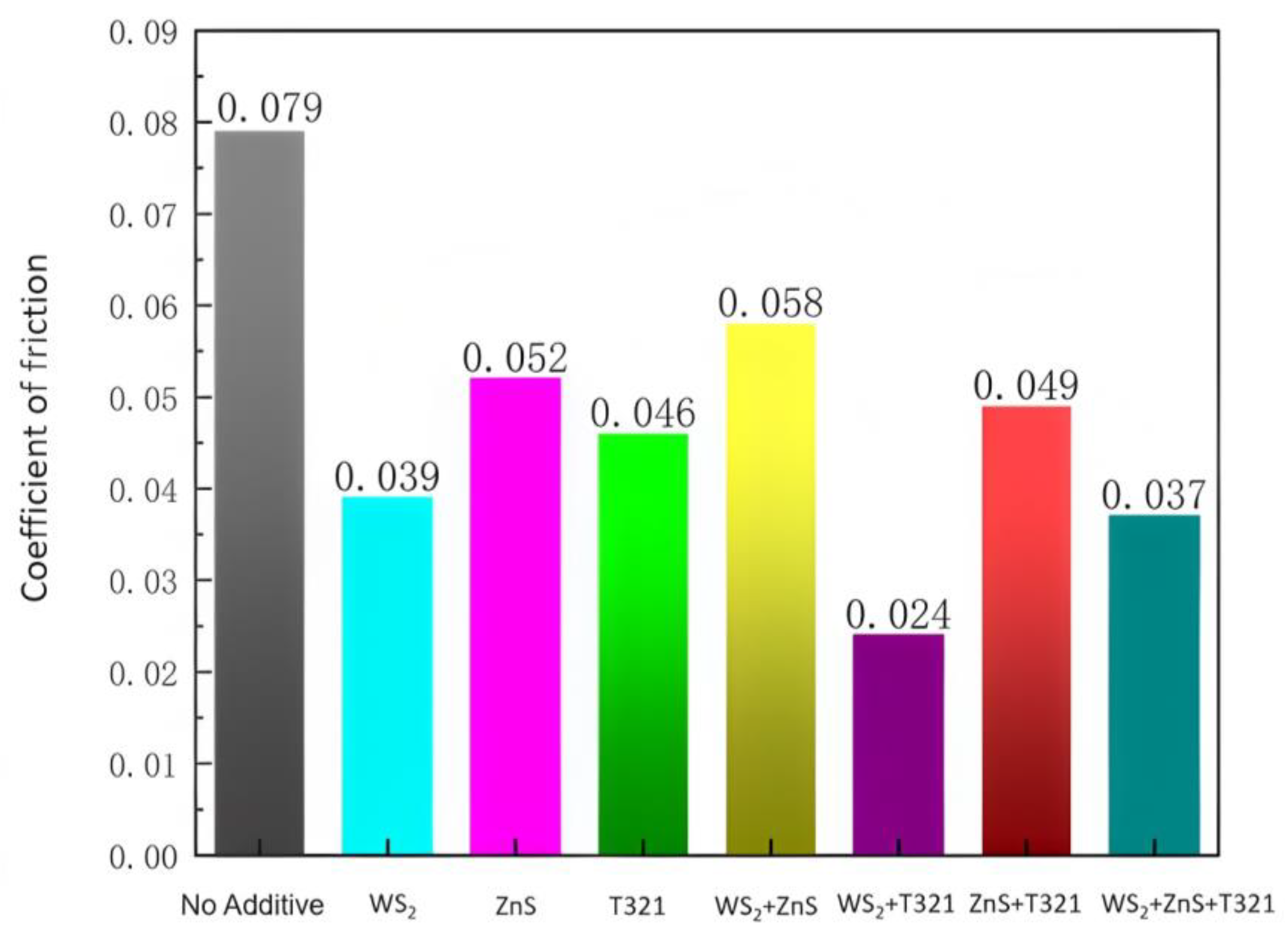 - Microscopic Elucidation of Lubrication and Wear Mechanisms: Current understanding of the synergistic effect between WS2 and T321 remains based on macroscopic performance inferences. Subsequent studies should employ surface analysis techniques such as scanning electron microscopy (SEM), focused ion beam (FIB), and X-ray photoelectron spectroscopy (XPS) to conduct detailed analyses of the microstructure, elemental distribution, and chemical states on friction surfaces. This approach will directly reveal the formation processes, structures, and mechanisms of action for friction chemical reaction films and solid lubrication layers at the atomic/molecular level, providing precise guidance for formulation optimization.