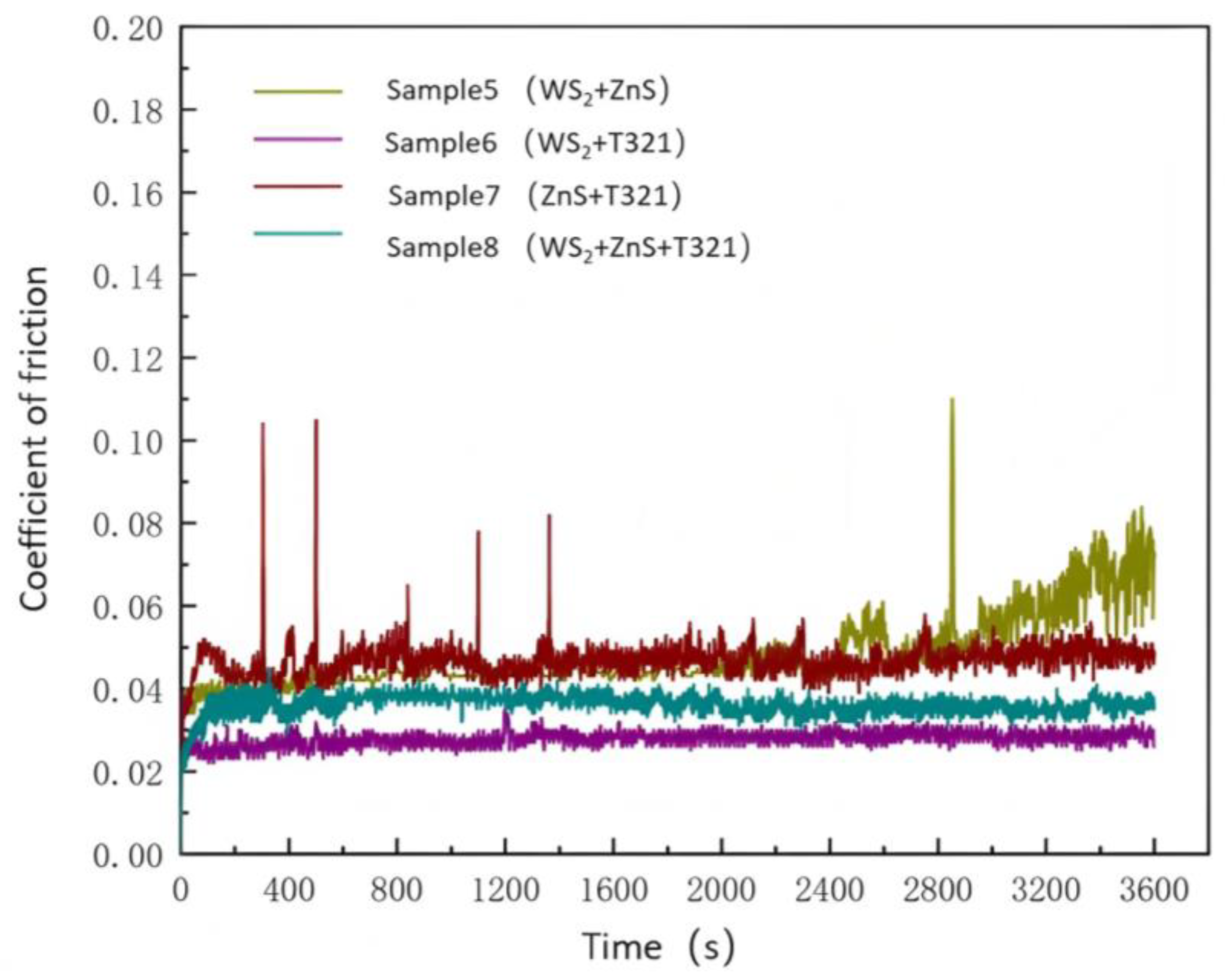 2.1.1. Friction Coefficient–Time Analysis of Different Samples Against Steel Balls